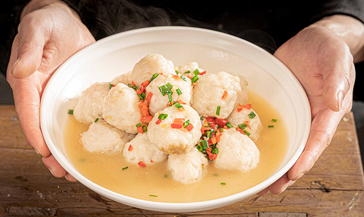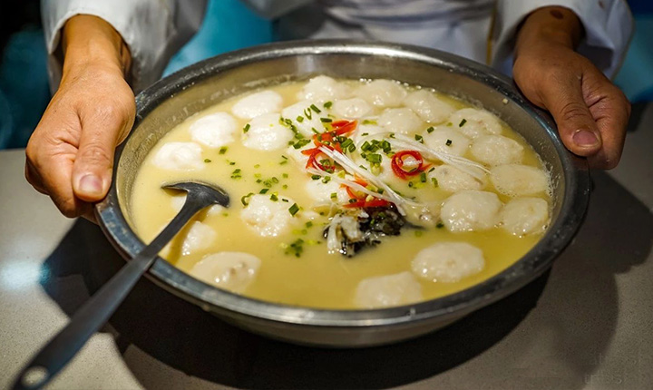 鱼丸,黄陂三鲜之一。用出自木兰湖的胖头鱼,只取鱼身中间一段的鱼肉。取刺。摔、打、剁成泥。浆制粘稠清水慢煮至定型。用以高汤慢烩15分钟。鱼丸耙酥软烂。汤清而不油。鱼丸Q弹嫩滑鲜香。汤鲜、鱼鲜、混合在一起的鲜甜,叫人欲罢不能。