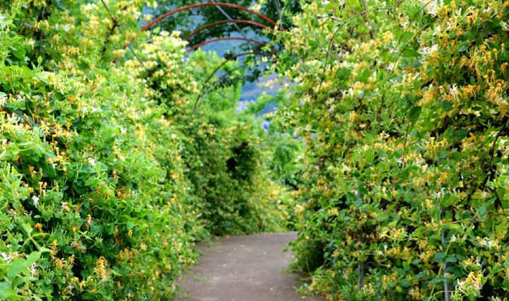 山包侧边,主人沿路搭起了架子,金银花、猕猴桃、紫薇花的藤蔓爬满了架子。
