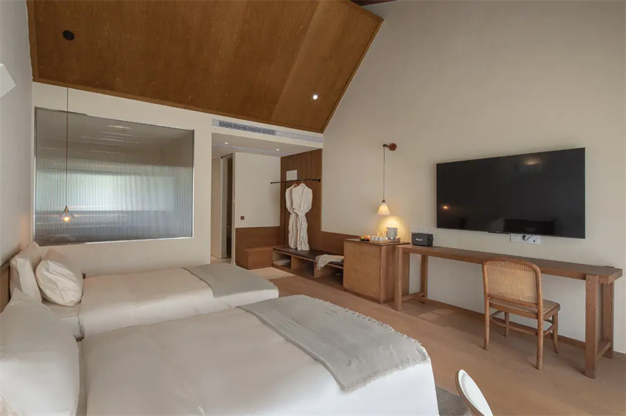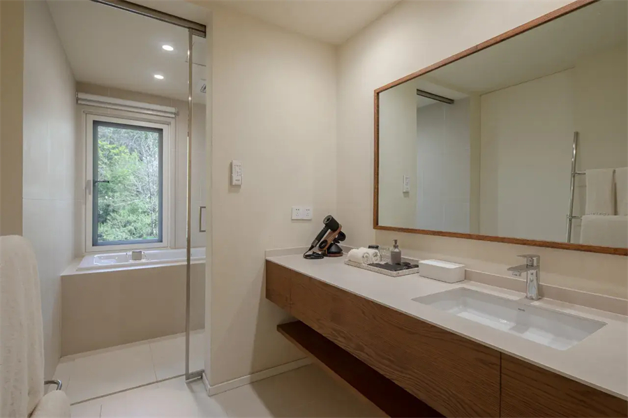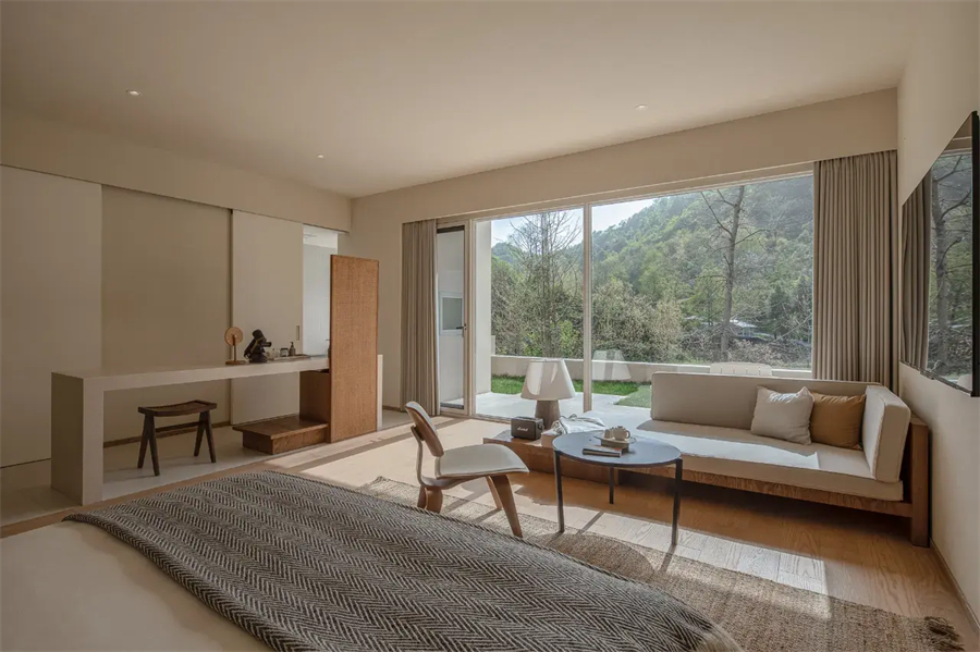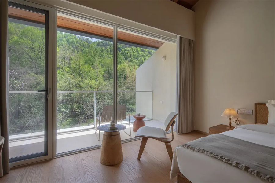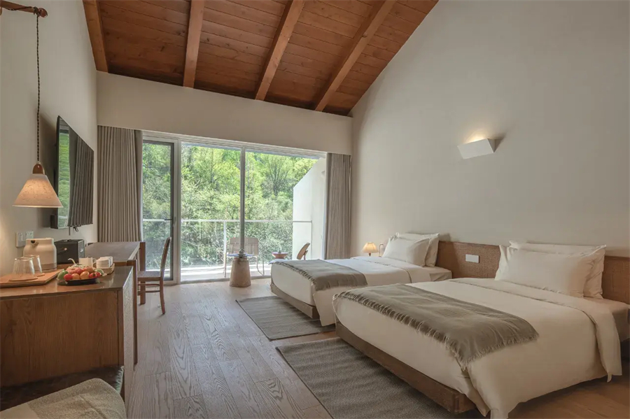 景观双床房以180°全景落地窗重新定义居住体验,清晨被第一缕阳光温柔唤醒,夜晚枕着银杏树影入眠。高品质的戴森吹风机等细节,让山野生活不失都市精致。