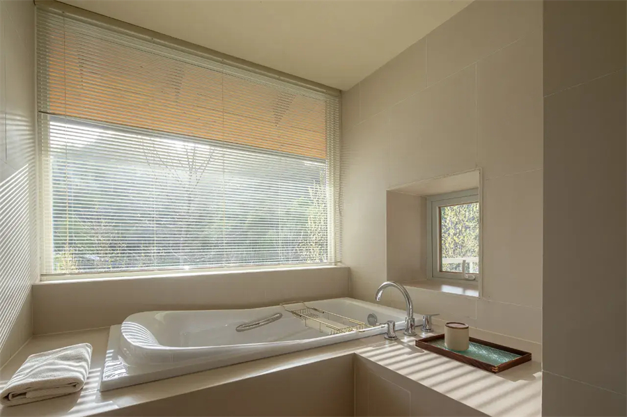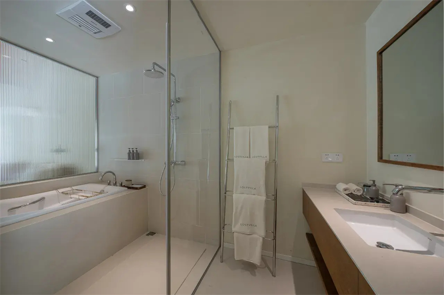 浴室瓷砖缝隙不见水垢,镜面始终锃亮,热水稳定且充沛,洗去徒步后的疲惫时,热水洗去一身的疲惫。