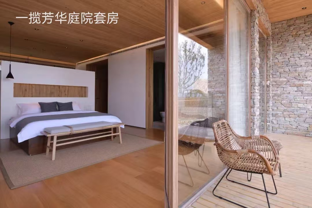 一揽芳华共3个房型,22个房间。走进一览芳华庭院套房,大面积的原木自然素材,整个空间一派静谧,呈现天然的质感,窗外湖光水色一览无余,颇有种归园田居的意味。