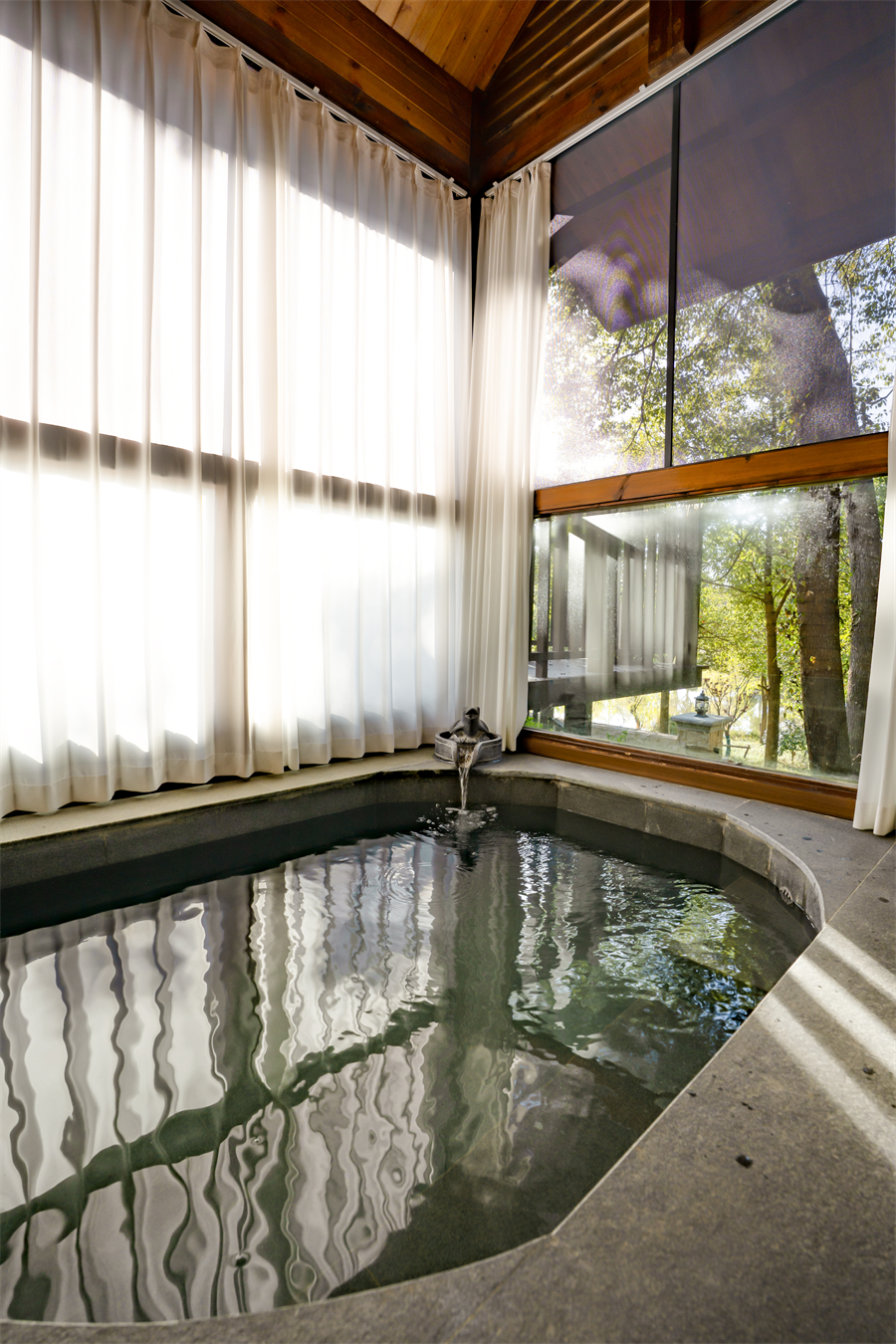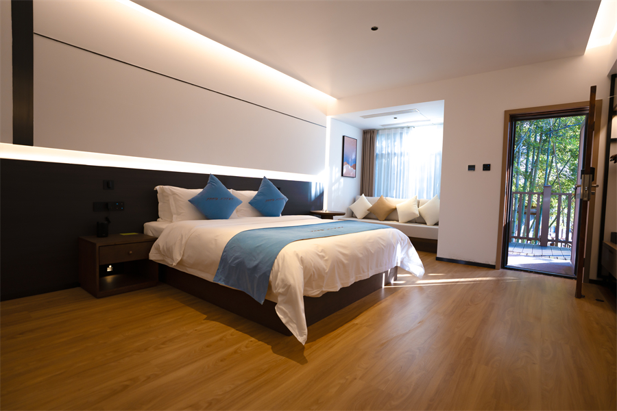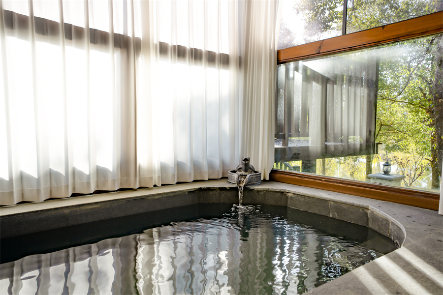 平层树屋大床房60㎡木质空间藏于竹林深处,1.8 米大床配温润寝具,推窗可见白鹭翩飞与香樟叠翠。房间经 2025 年升级改造,地暖系统保障四季恒温,独立区域设木质温泉泡池,接入 76℃偏硅酸珍稀温泉,半小时即可注满,夜泡时能听虫鸣伴星空。