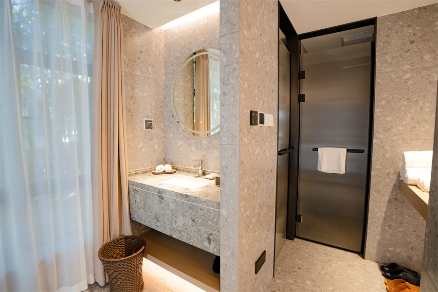 步行 5 分钟达恐龙贝乐园,地暖与防滑设施适配家庭出行。晨起林间漫步、暮时私汤疗愈,尽显归隐之趣。