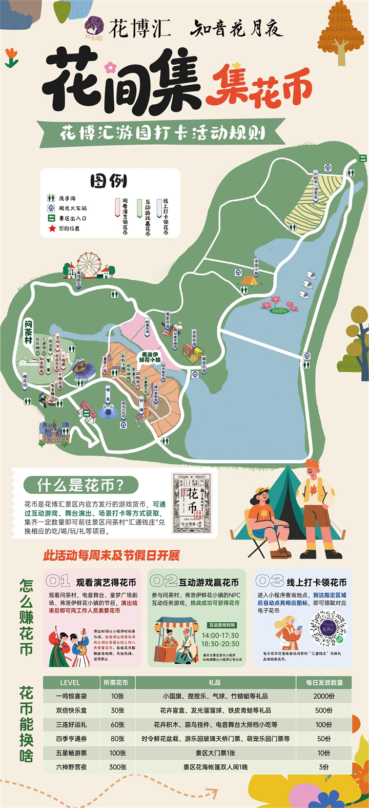 景区全新打造「花间集」多点位沉浸式打卡活动,游客可在四季花海、问茶村、弗洛伊鲜花小镇等多个点位,通过互动游戏、场景打卡、演出打卡获得花币,通过花币可兑换礼品,解锁隐藏福利。快来花博汇感受“一步一景、景景皆趣”的沉浸式魅力!