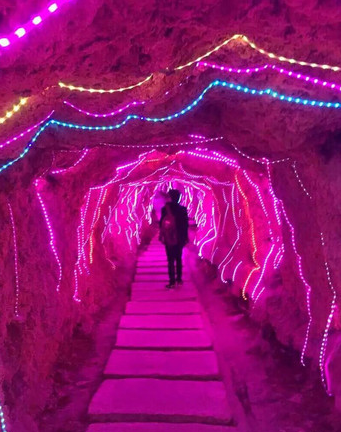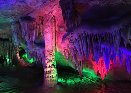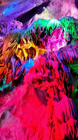 穿过拱桥,拾级而下,就是探玉处溶洞。米黄的洞壁,湿润滴水,幽暗的洞窟,各种形状各异的石钟乳石笋,分解着各类的故事。曲肩弓背,小心翼翼观赏者大自然的馈赠,在霓虹灯下妙趣横生的岩溶,更让人如临仙境。