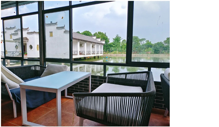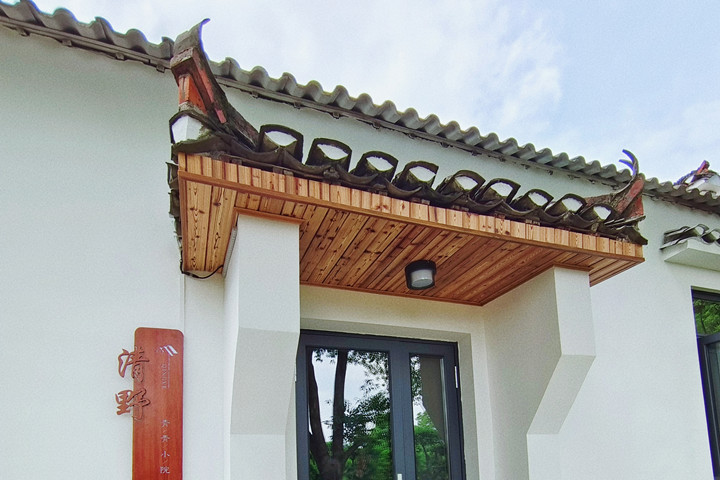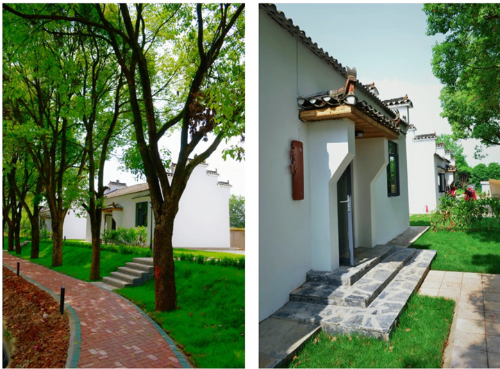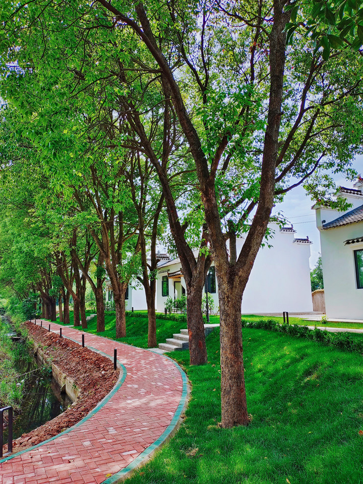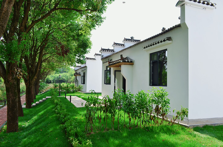 步入农庄,一眼就能看到栋栋白墙黑瓦的民宿建筑,藏在绿树浓荫里,周围大片翠绿草坪包裹,静谧清幽,别具韵味。