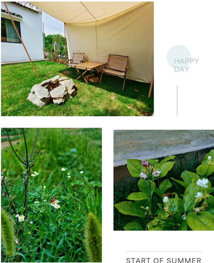 伴着丝丝缕缕的茉莉花香,和好友一起坐在天幕下,泡清茶、吃点心、话家常,开启精致的下午茶时光~绿丛中,各色野花点缀,还有蝴蝶、狗尾巴草,感受纯粹的自然气息。
