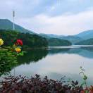 朝霞尽染,薄雾缭绕,山水相映,风景如画