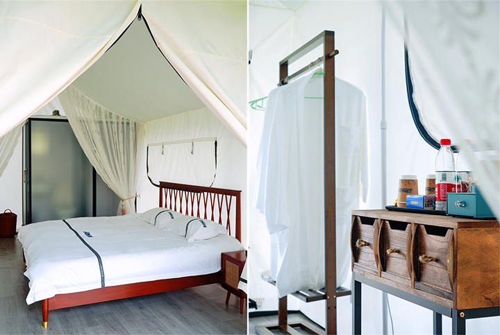 虽然是帐篷,但是房间内部的设施一点也不马虎。敞亮的空间里,设有独立卫浴空间、空调、大床或双床,让人能够在无限亲近自然的空间里,尽享惬意、舒适度假。