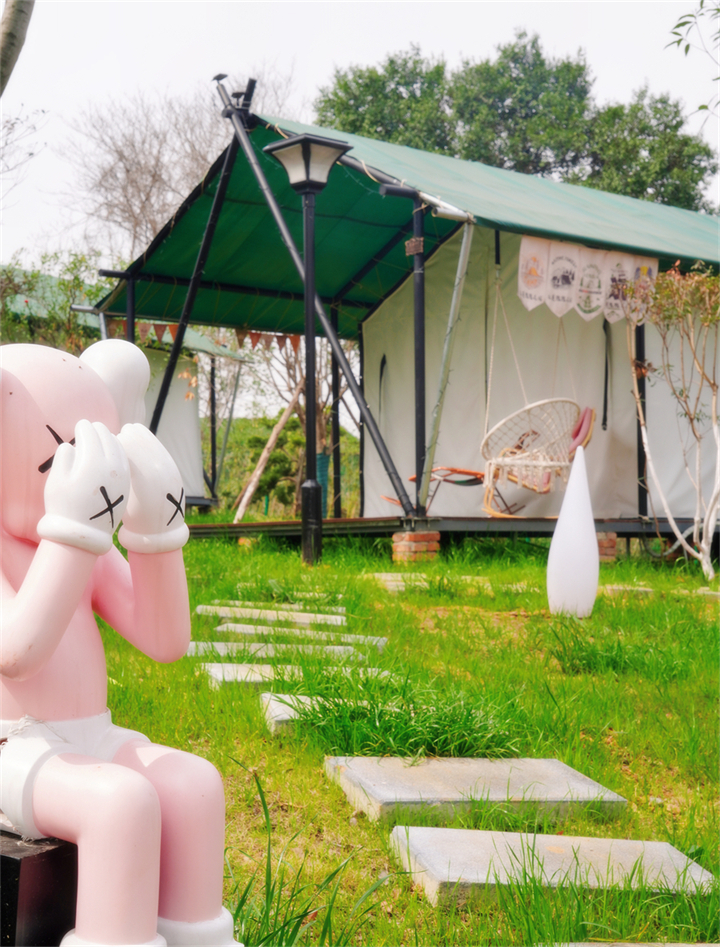 彩色的风车随风转个不停,鲜艳的蘑菇从大树下冒出来,树下的两只长颈鹿像是在窃窃私语.....来到这里,仿若置身于梦幻的童话世界。不用自带任何露营装备,一顶顶白色的帐篷早就扎住在绿意里了,只等你来体验。