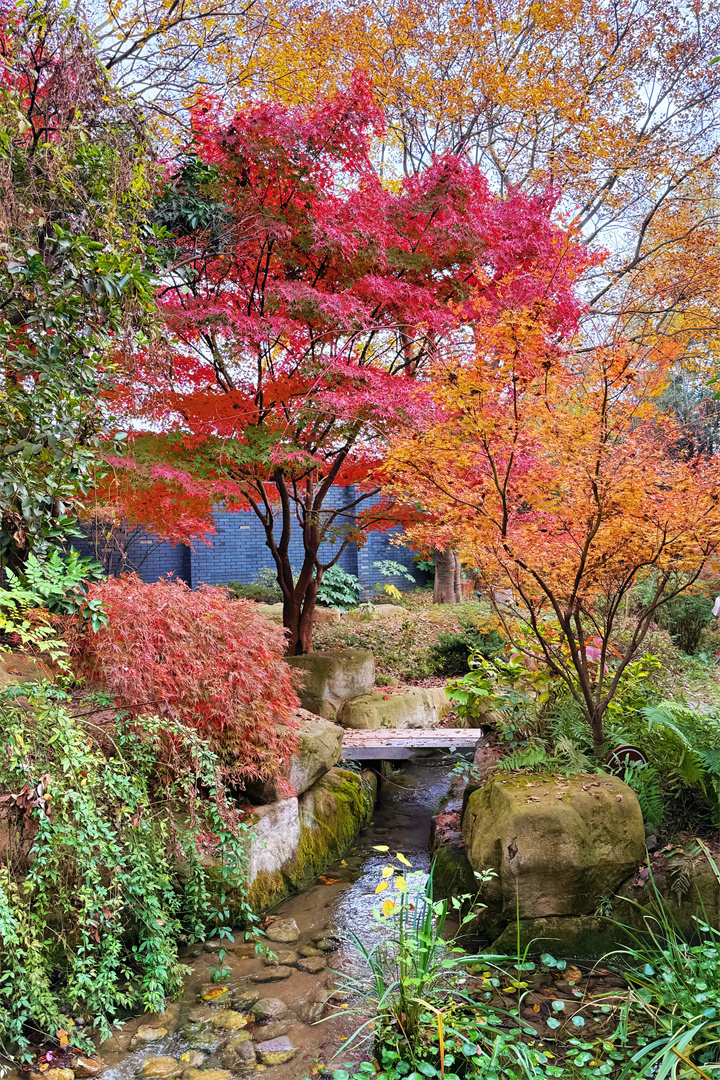 鸡爪槭的枝叶十分优美,如手掌般舒展大方。每一片叶子都写满了生命的韵律,潺潺流水与耀眼红叶相互映衬,动静之间,更显雅致之美。