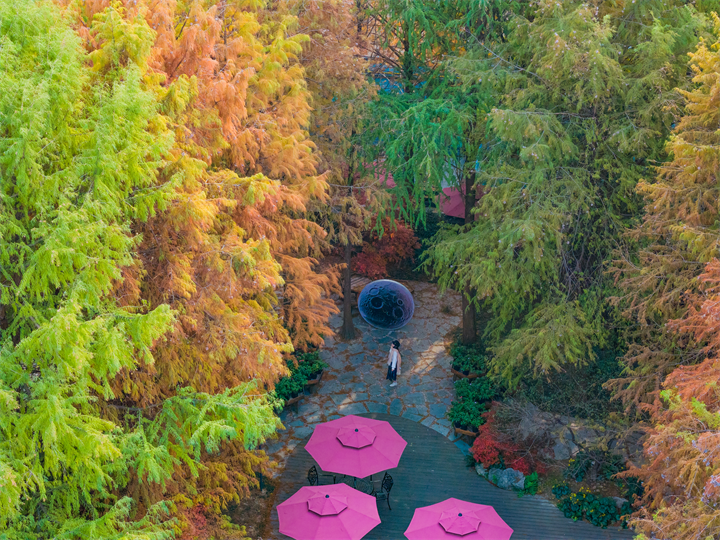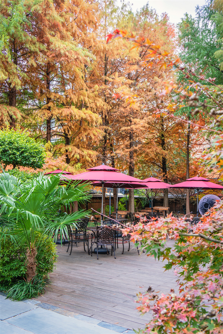 竹篱笆墙围起的“上花园”,是另一个出片的好地方。与花街相邻,旁边是咖啡馆,竹篱笆墙隔绝了凡尘喧嚣,冬日里成排的水杉逐渐由绿转黄再转红。你可以在店内喝咖啡,也可以将下午茶搬进花园里,随时开启一场心灵的漫游。