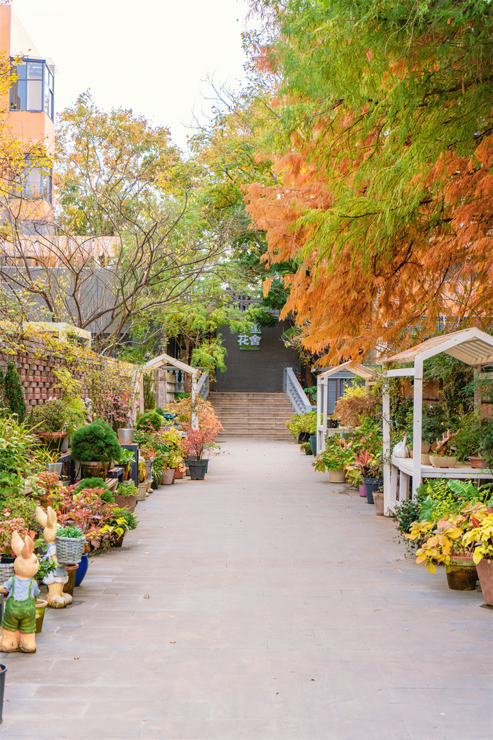 走出中式小院打卡长达200米的花街,沿路摆满多肉及各种造型盆景,还有丰富的雕塑、装饰品点缀,充满了艺术感。每走几步就有一套桌椅,顺势坐下,捧起一本好书、一杯咖啡,便足以享受一个悠闲的下午。