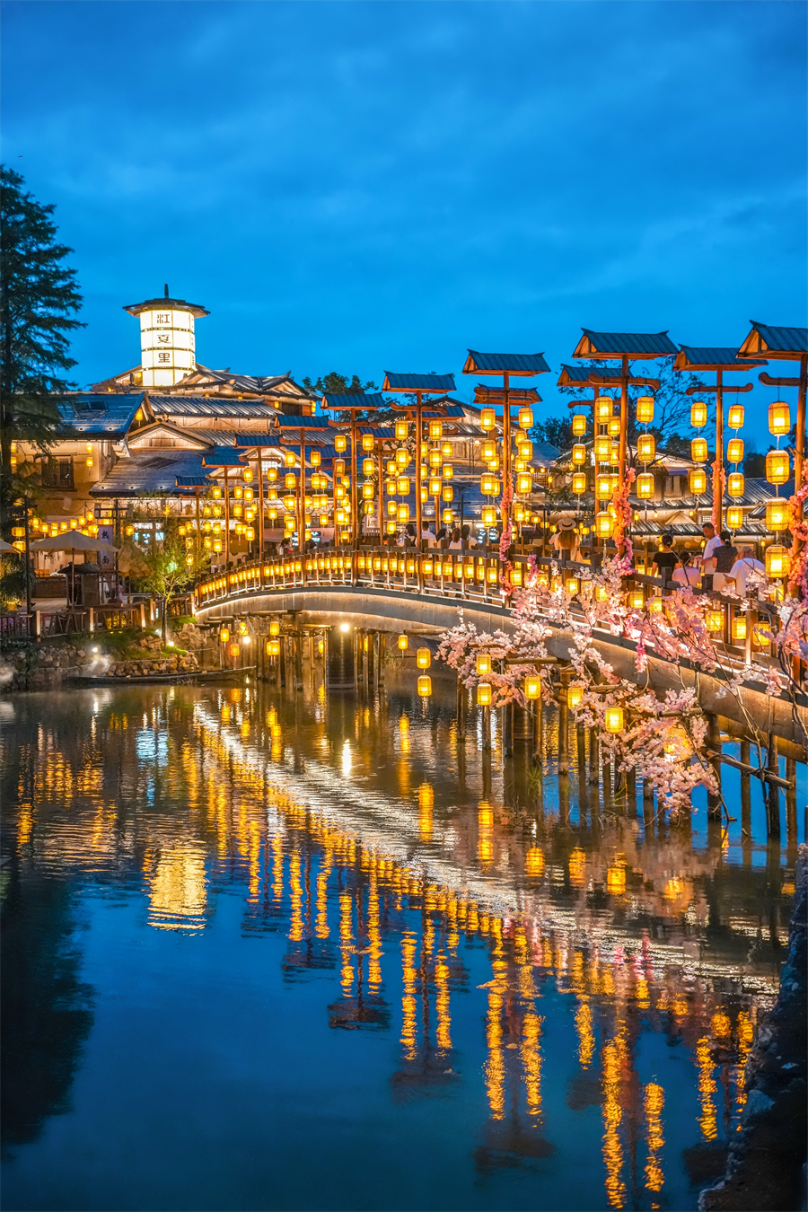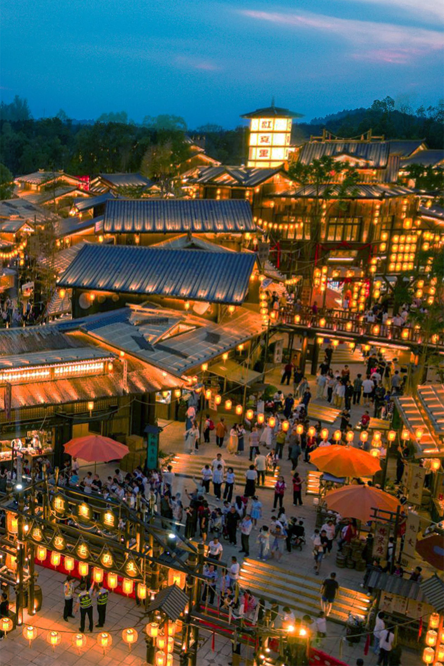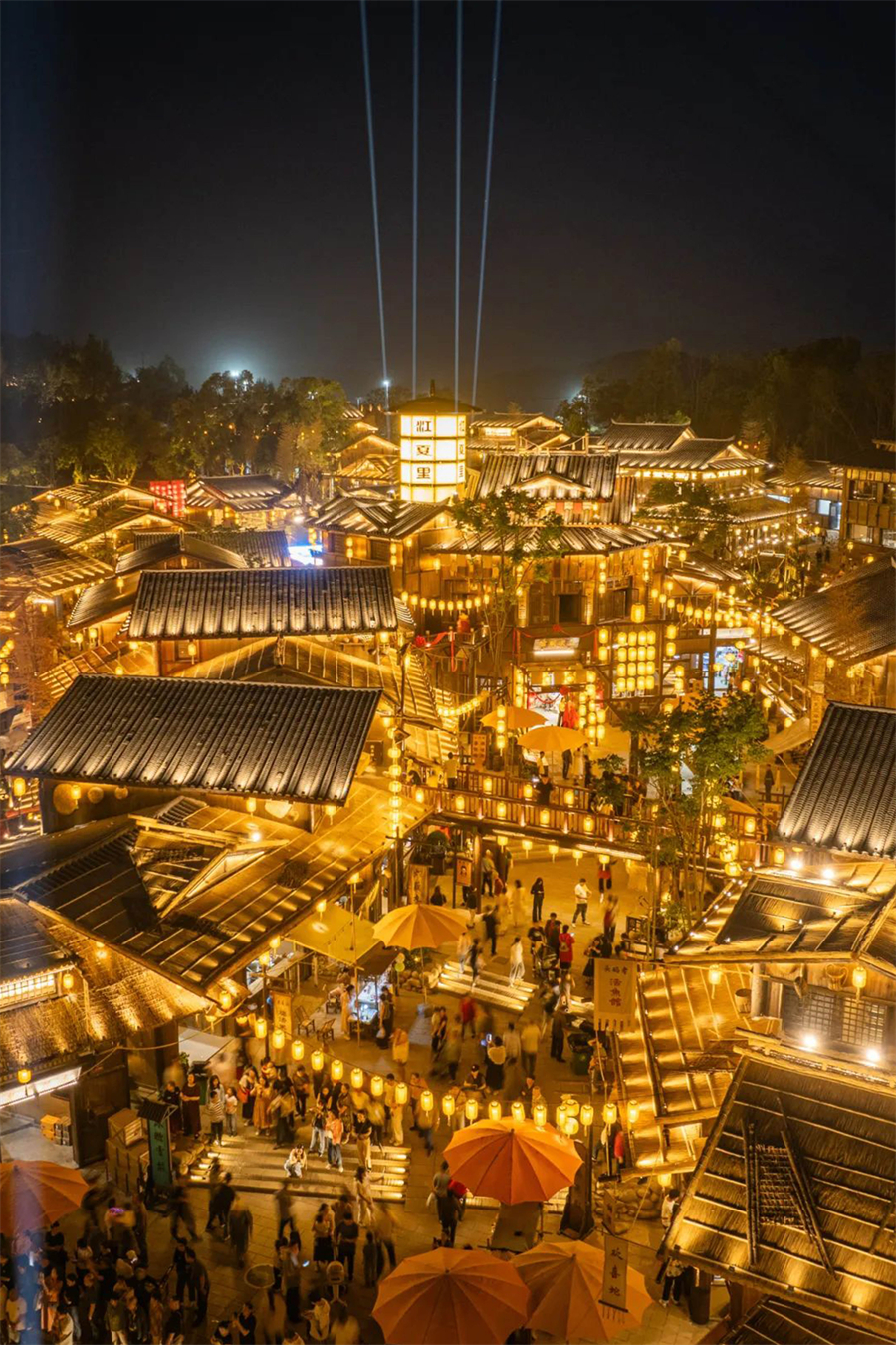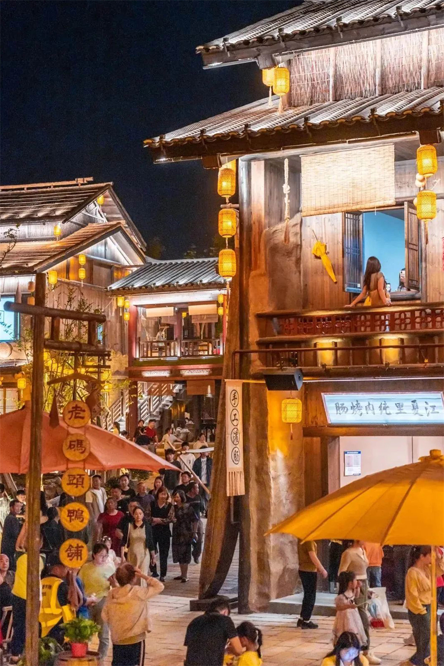 清风拂过檐角,千盏灯笼轻轻摇晃,锈迹斑斑的船锚静卧街角,复古黄包车雕塑定格旧时光;红砖厂房与铁艺楼梯透着工业风底蕴,雾森系统让古桥流水似浸水墨,行走其间,仿若穿越时光,回到船笛声与鼎沸人声交织的年代。