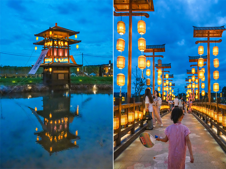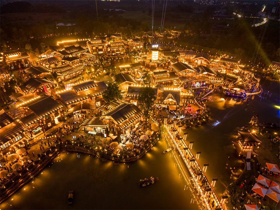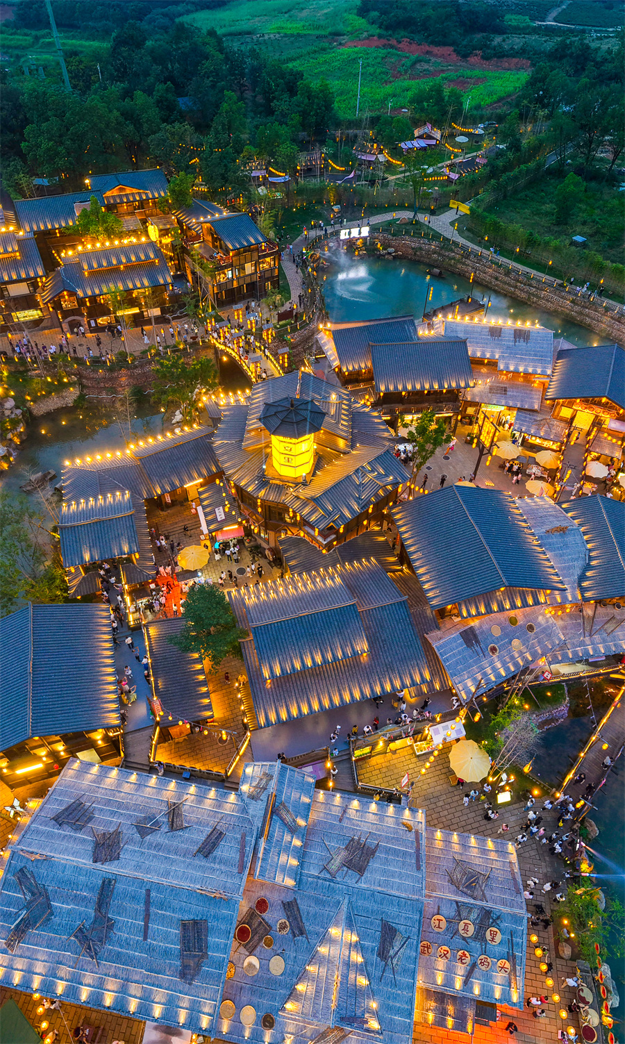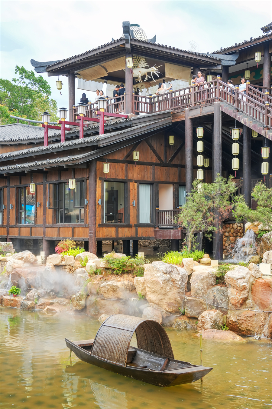 清风拂过檐角,千盏灯笼轻轻摇晃,锈迹斑斑的船锚静卧街角,复古黄包车雕塑定格旧时光;红砖厂房与铁艺楼梯透着工业风底蕴,雾森系统让古桥流水似浸水墨,行走其间,仿若穿越时光,回到船笛声与鼎沸人声交织的年代。