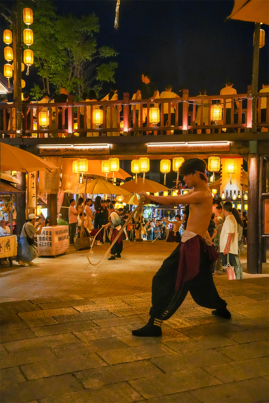 白日是 “市井烟火图”—— 青石板路蜿蜒,45 个美食档口香气四溢;夜晚化身为 “光影诗画境”—— 灯光秀勾勒古建筑群,水上画舫与灯影交辉,东门樱花桥的灯笼串成为网红打卡点,续写 “不打烊的烟火剧场”。