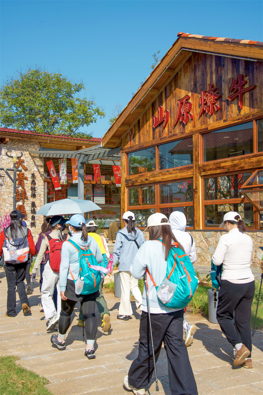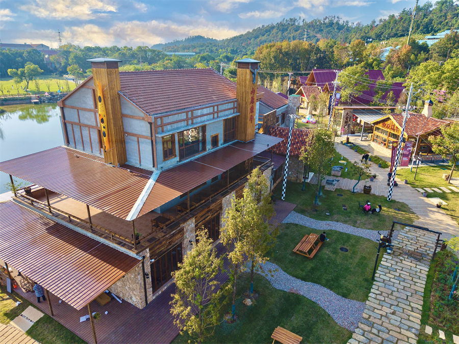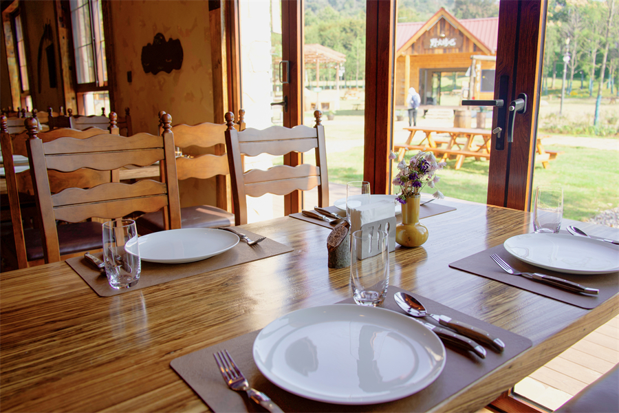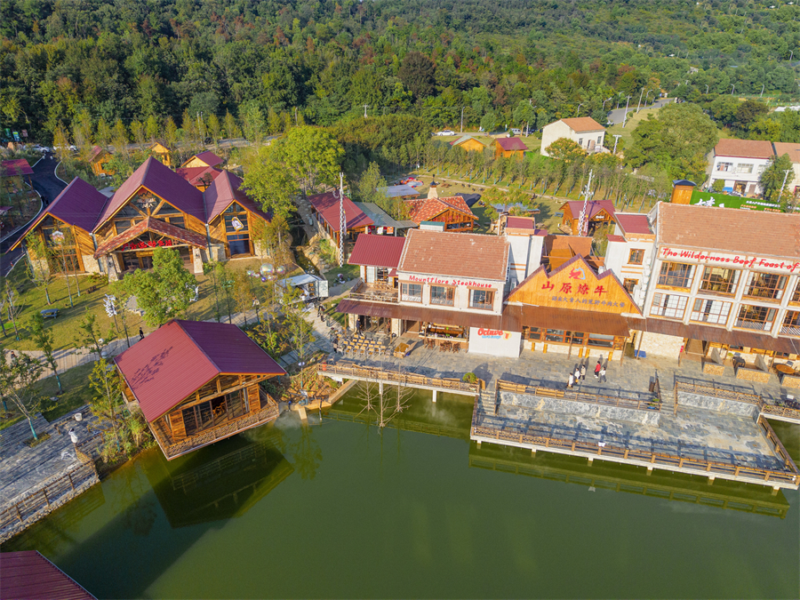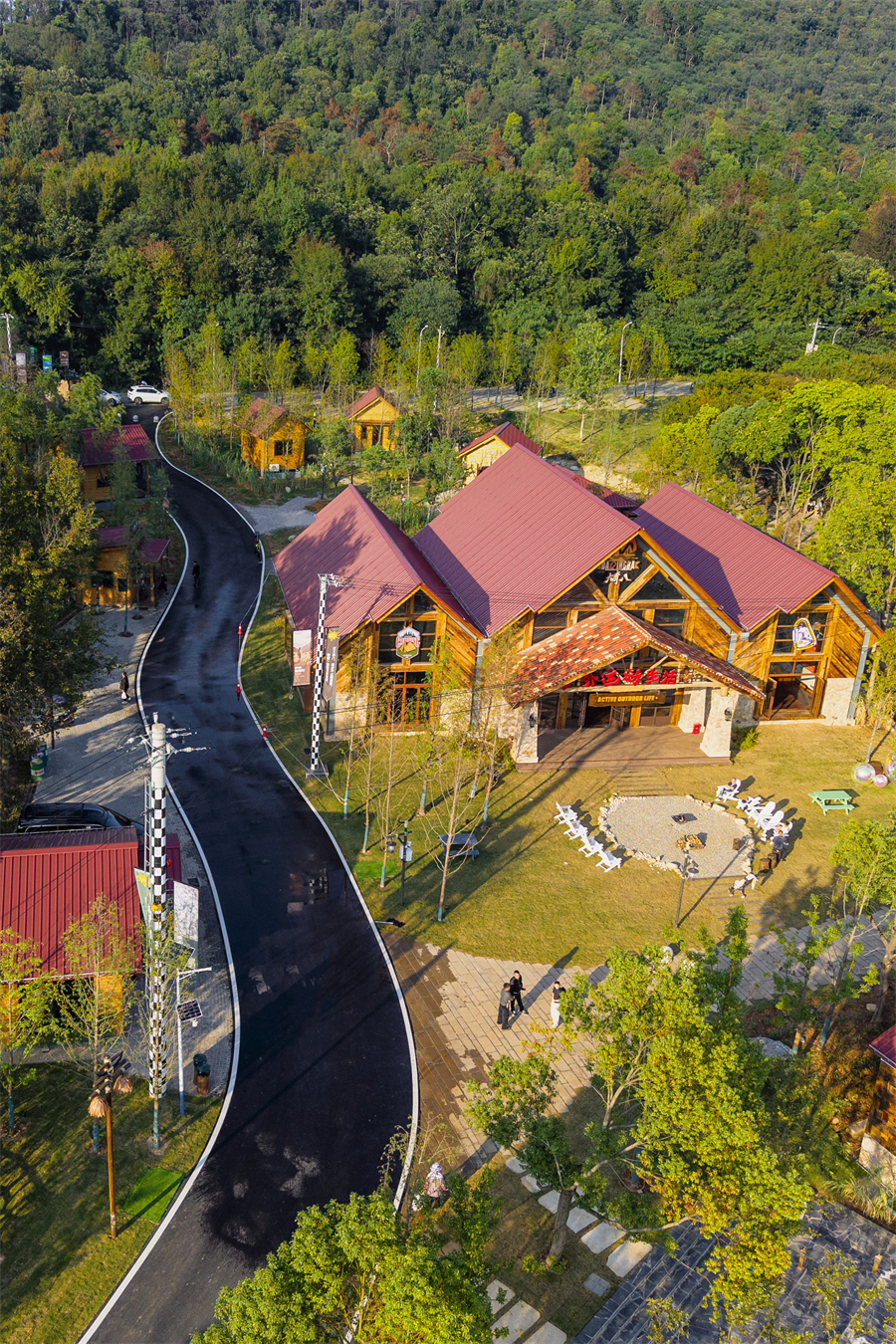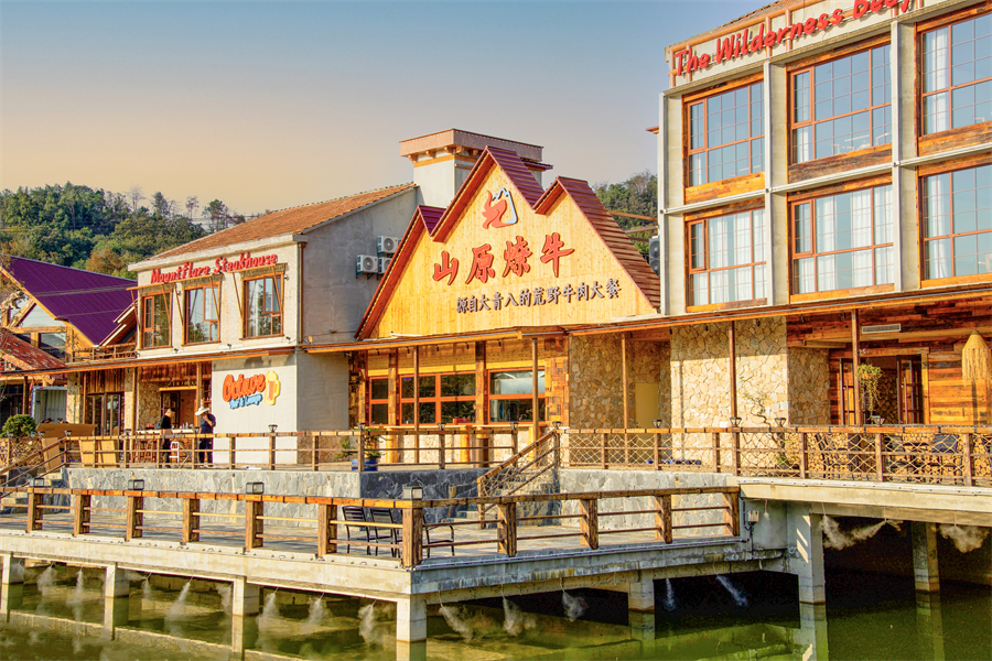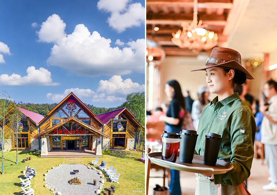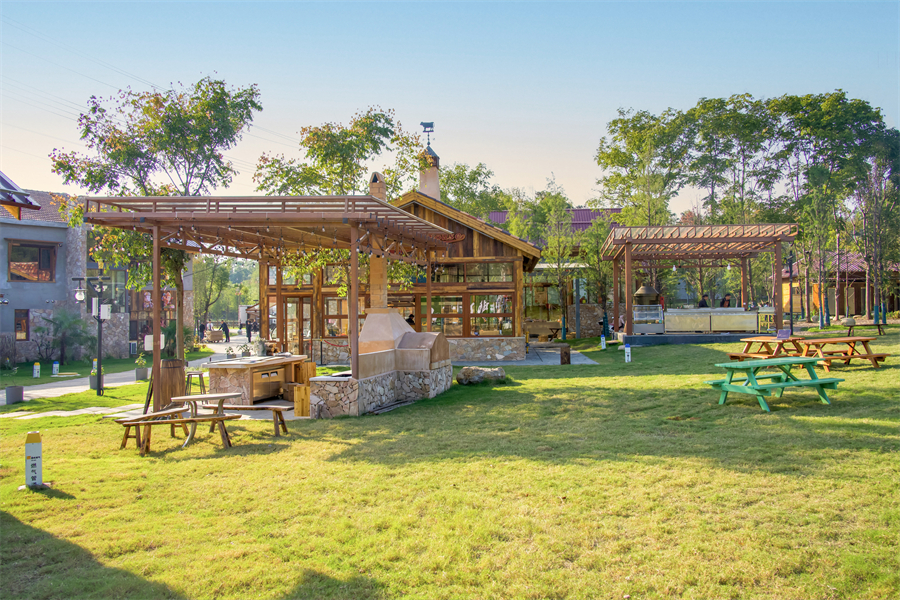 这里是大青八户外运动村,得名于大花山、青龙山、八分山的三山环抱。33 公里绿道串联起的近 200 亩天地间,《决战犹马镇》的西部美学与荒野肌理完美交融:牛仔装扮的服务人员穿梭于啤酒桶与壁炉之间,中央广场的篝火旁飘着欢歌,烤架上的小黄牛油脂噼啪作响,构成最动人的山野交响。