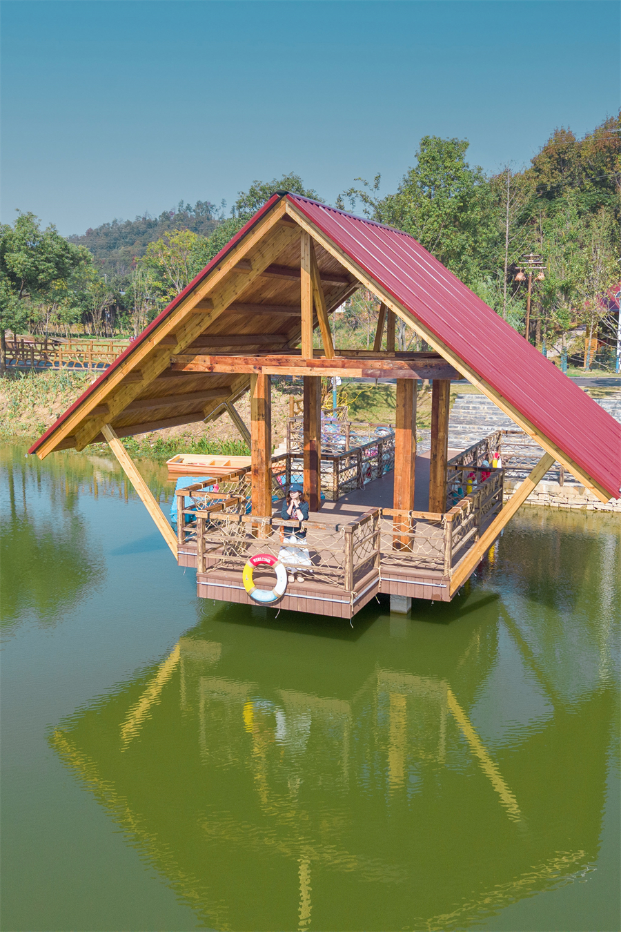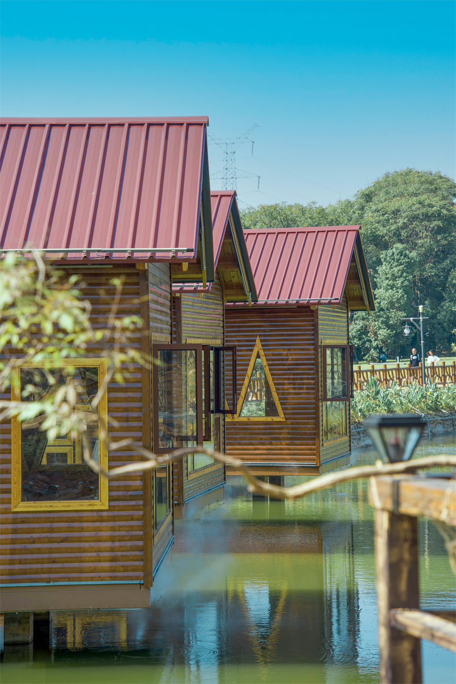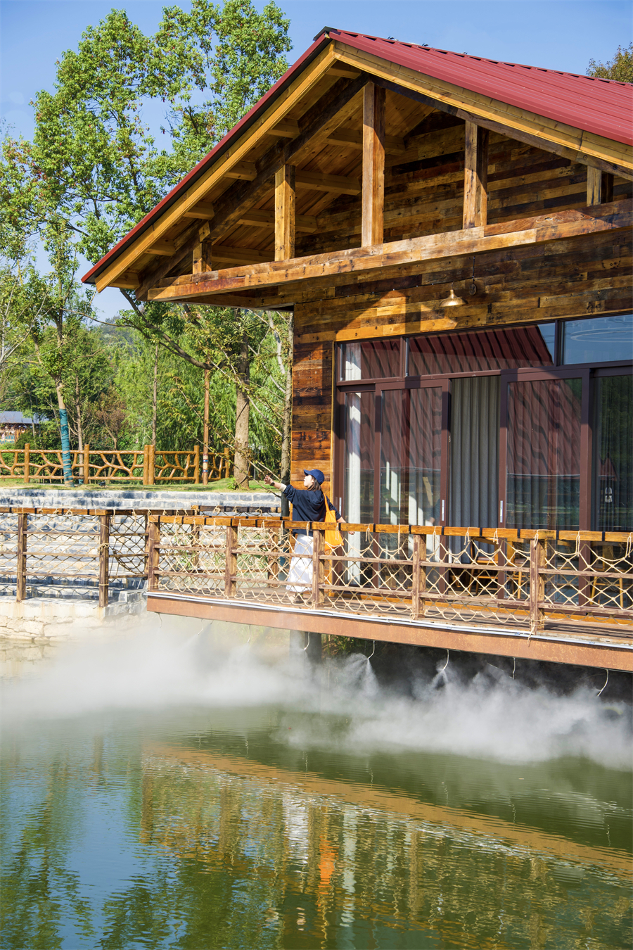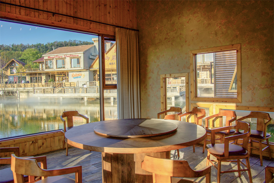 湖边临水而建的独立小屋是隐藏的宝藏区域:木质结构与山水景观融为一体,推窗就能看见波光粼粼的湖面与青翠山景。屋内配备投影、桌游等设施,工作人员还能按需提供餐饮配送服务,让欢聚时光更自在,野趣与舒适兼得。