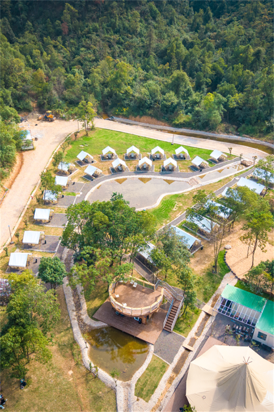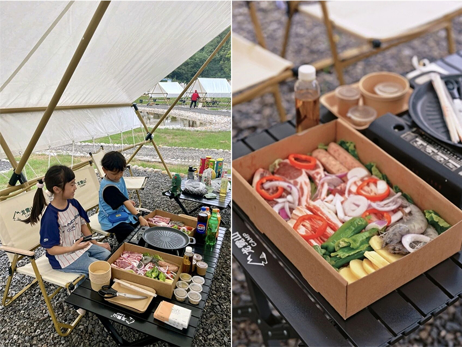 营地配套堪称 “贴心”:接待中心、咖啡厅、公共卫生间、淋浴室一应俱全,完全满足过夜需求。23 个固定营位沿溪水排布,4-8 人的小营位适合好友小聚,8-12 人的大营位能容纳一群人的热闹;后续营位旁还将种植枫树,明年秋日枫叶染红时,露营氛围更显浪漫。