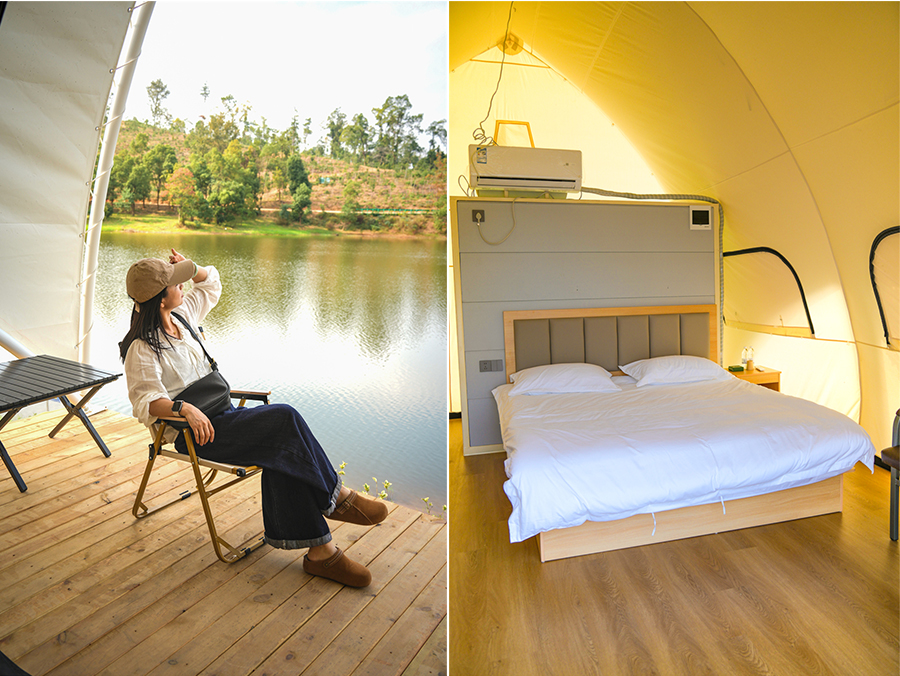氛围感拉满的住宿体验:10 间湖景帆船帐篷是营地的 “宝藏”,每间都带空调、独立卫生间和亲水露台。无需起身,躺在床上就能将水库波光与远山景致尽收眼底;入夜后,岸边串灯次第亮起,晚风携着虫鸣掠过,浪漫又治愈。