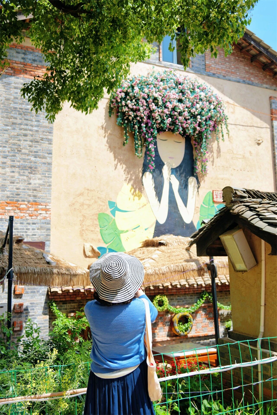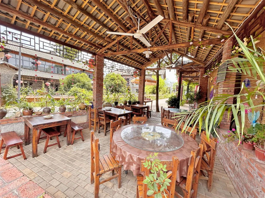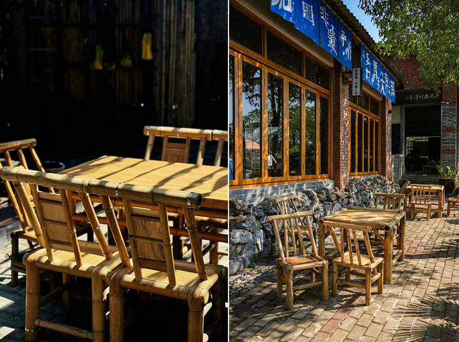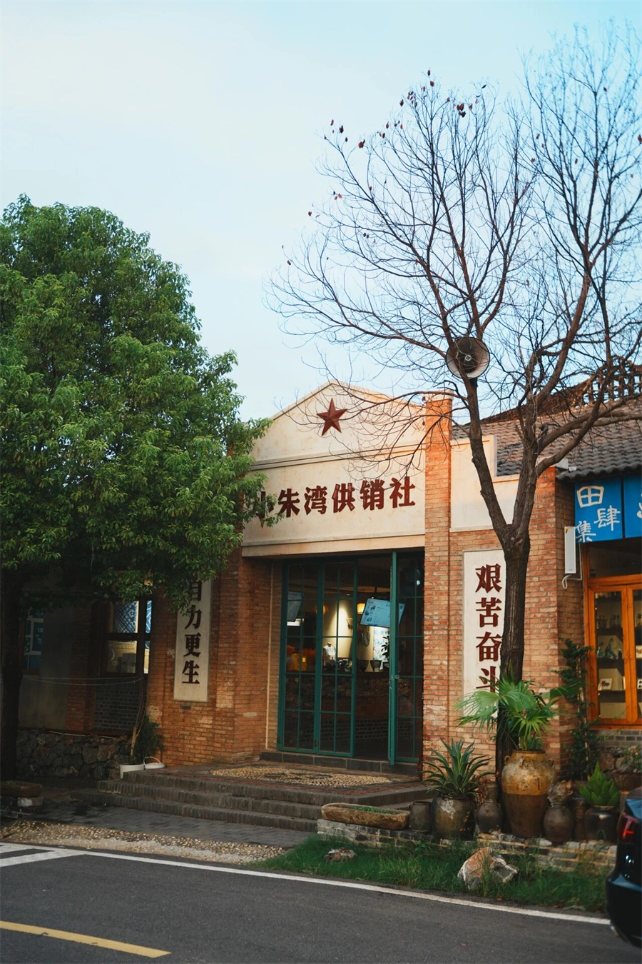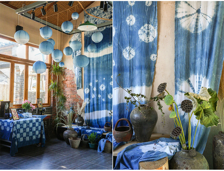 红砖老墙、原木窗棂、非遗蓝染的布料肆意垂落,小朱湾供销社的红砖老房,重新焕发了生机。门口长廊,用种满花草的老陶罐做围墙,每一处都在诉说着新故事。