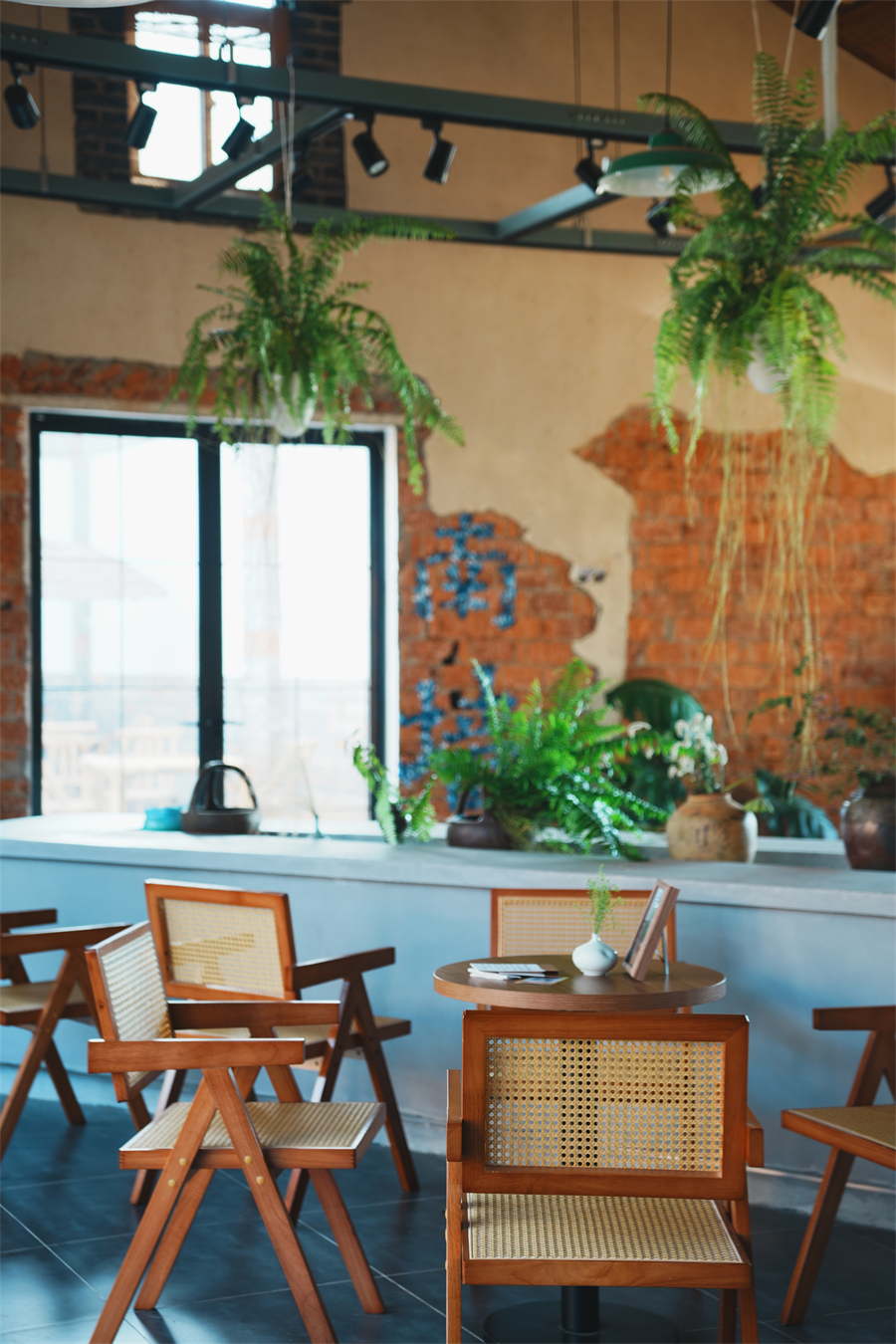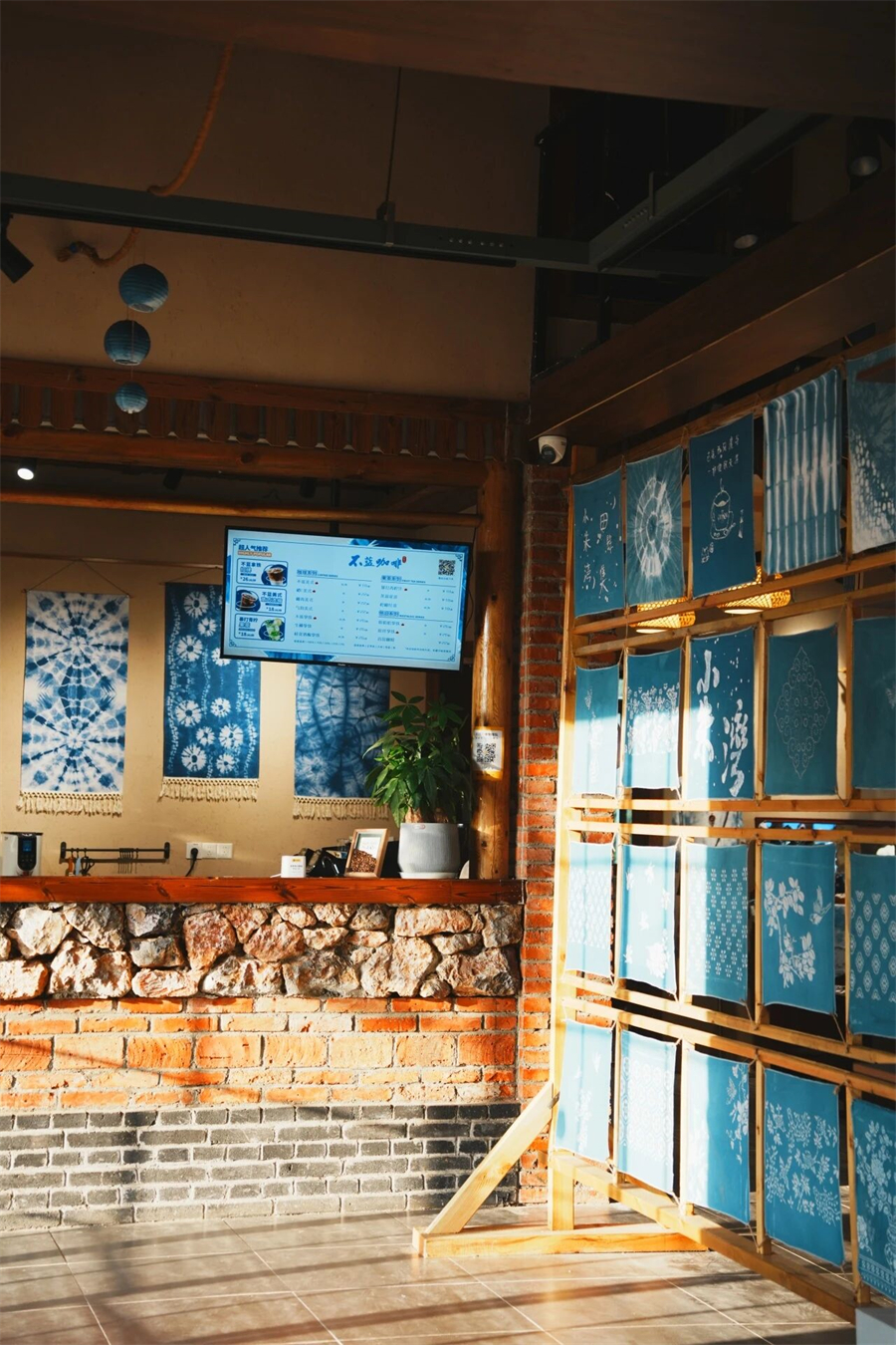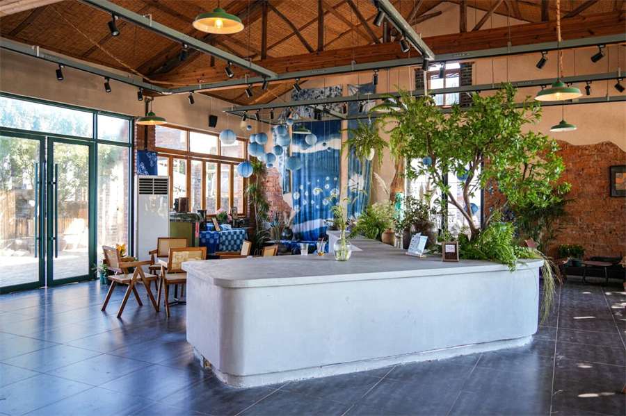 推开虚掩的玻璃门,咖啡的醇香与蓝染的清新草木气息扑面而来。粗糙墙面带着岁月的颗粒感,原木色桌椅、葱郁的绿植与无处不在的蓝,碰撞出温柔的交响。