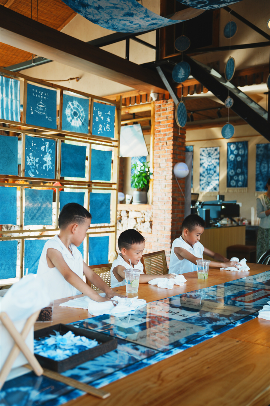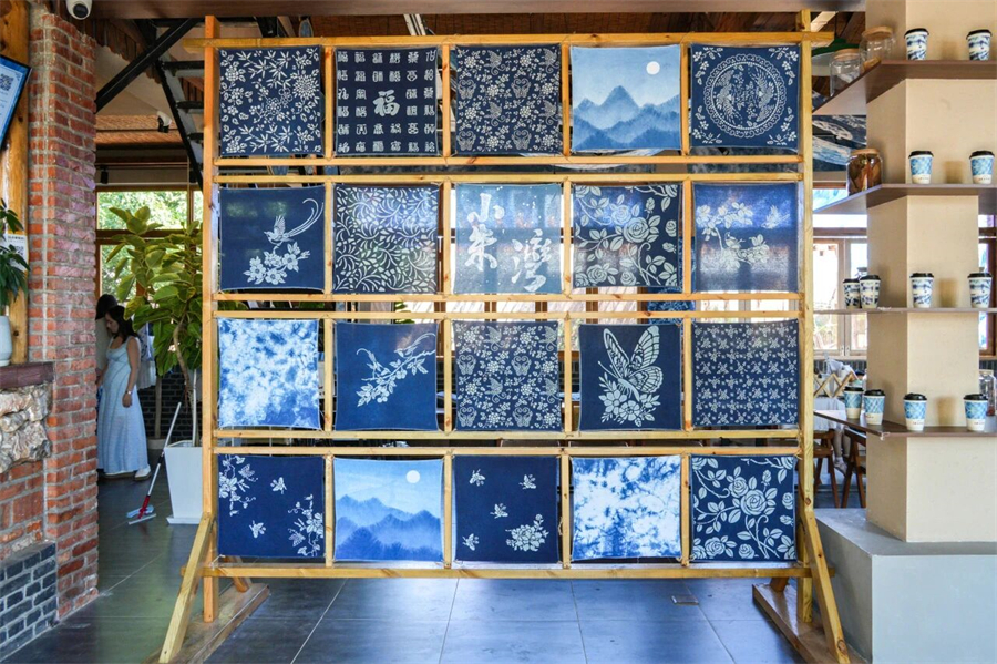 负责人陶老师这样解释:因为我们每天都要染布,第一个想到的就是“布蓝”。同时希望通过这种非遗工坊+村咖结合的方式,让非遗技艺得到传播和传承,于是谐音之下,「不蓝」就诞生了。