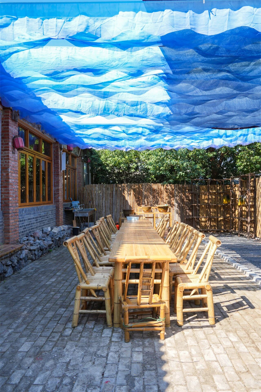 院子里的大长桌,头顶有片随风飘动的“海”~在斑驳的光影中,手作、聚会、团建,办一场小而美的生日派对。