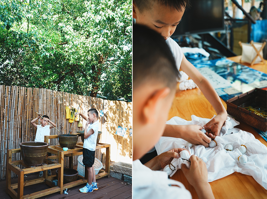 在「田肆集非遗工坊」老师的带领下,和小朋友一起亲手尝试扎染、蜡染、竹编、漆扇,把时间“浪费”在美好事物上。带走一块属于自己的作品,带走一段关于非遗的独特记忆。