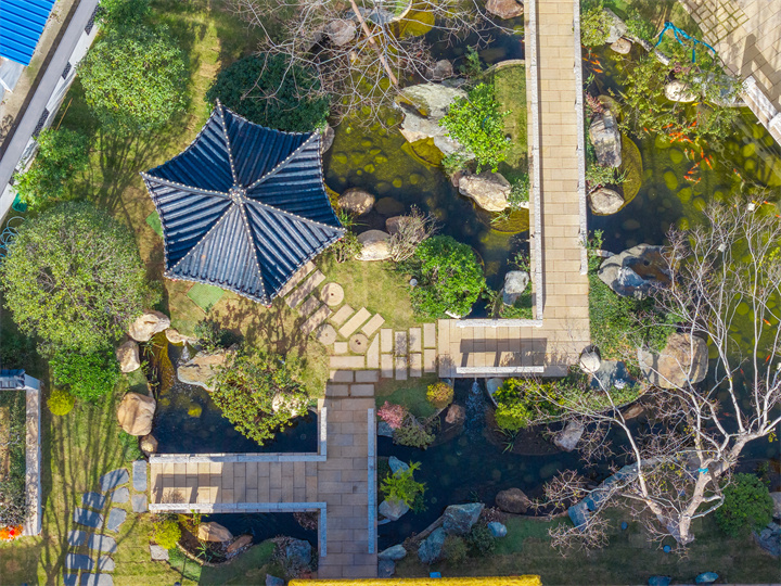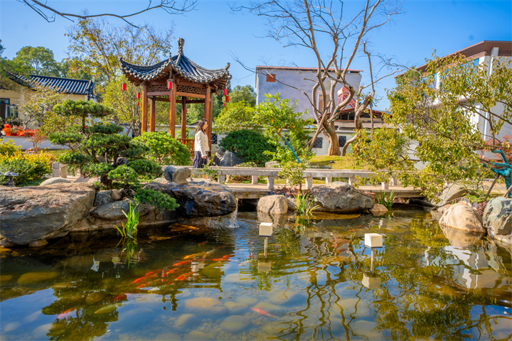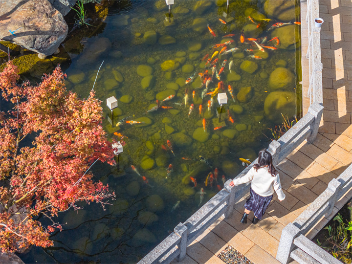 沿路而行,看锦鲤嬉戏、闻花香浮动,一步一景,都市喧嚣瞬间被隔绝。