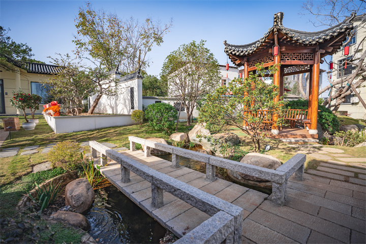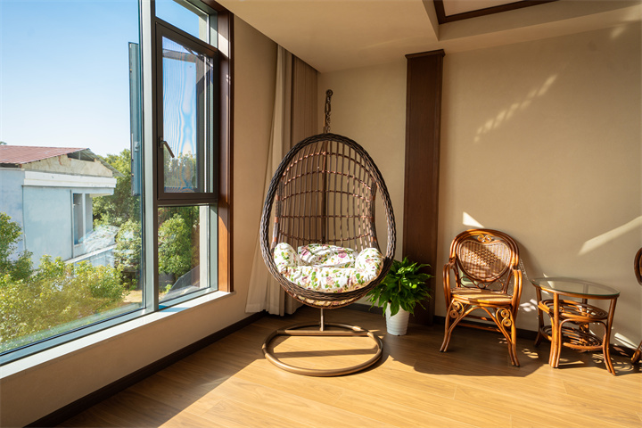 房间都带超大落地窗,将院子里的诗意画卷请入室内。靠窗的位置还配备了吊篮藤椅,晴天午后,窝在椅子里晒太阳、看风景,特别惬意。