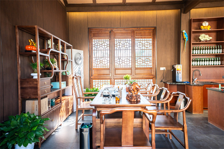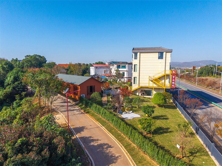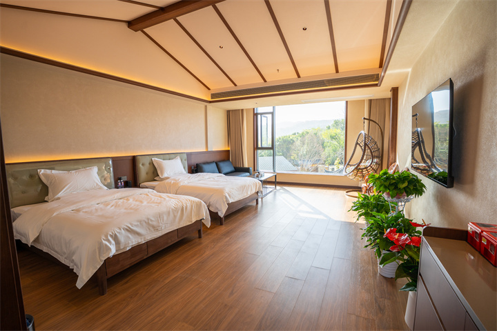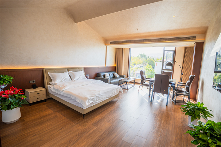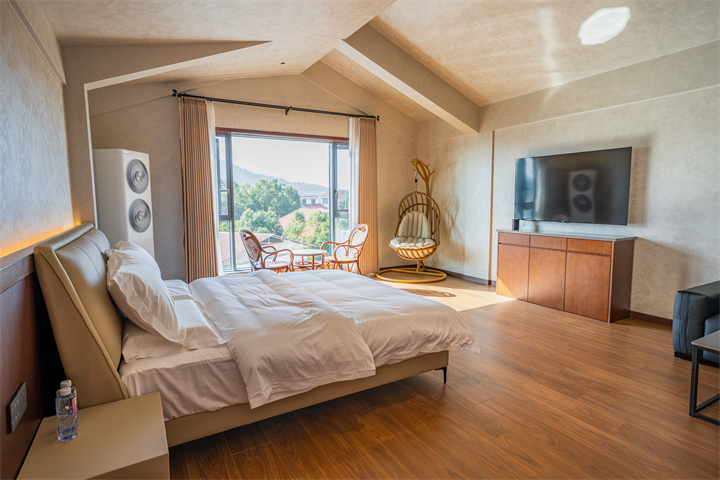民宿有14间房,大部分位于四层主楼,包括大床房、双床房、豪华套房。每间房间空间都很足,而且配备小度智能系统,让人一键掌控舒适。
