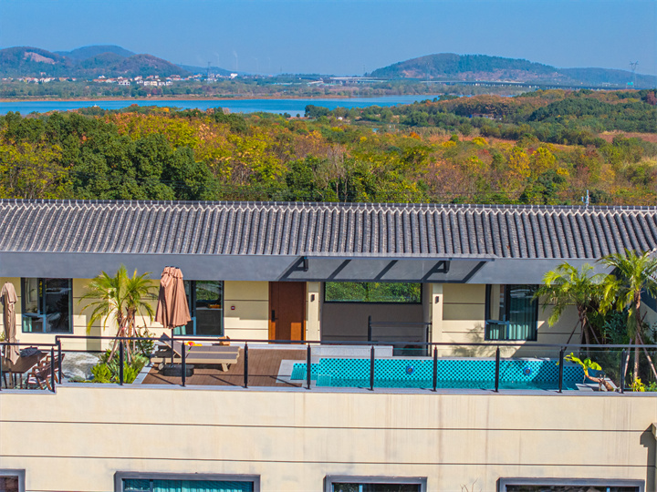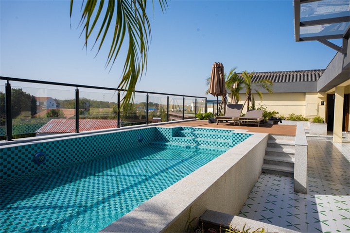 楼顶区域主打休闲,设有一座漂亮的泳池,还有休闲茶室。澄澈泳池搭配躺椅、绿植,仿佛在海边度假,夏天玩水清凉又出片~