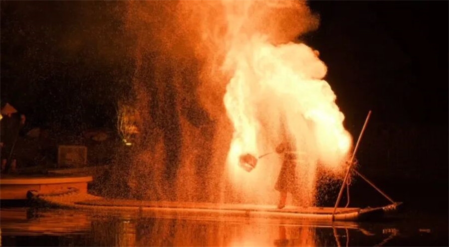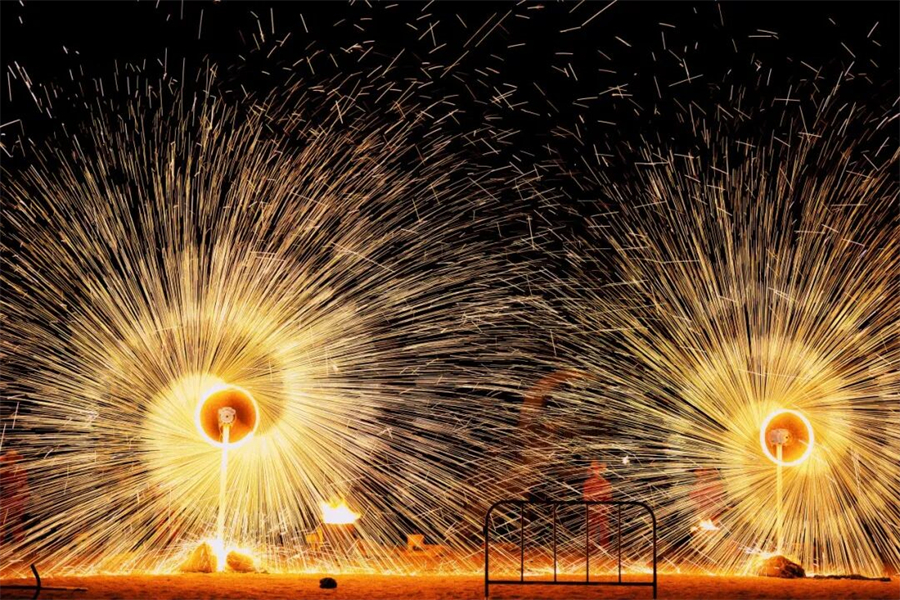 震撼非遗演绎:夜幕下的重头戏,当属国家级非遗——打铁花。只见匠人将1600℃的铁水奋力泼向夜空,瞬间化作万千金色流星雨,绚烂夺目。与之相伴的“火壶表演”更似烈焰之舞,火星飞舞,光影交织,构成一场原始而震撼的视觉史诗。