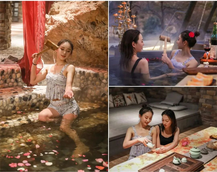户外三米高的三角架中,吊置一个巨大铁锅,铁锅中加入天然的泉水、药材和鲜花,然后加柴点燃,温度上升之时你就可以“入锅”泡汤了。 锅中成隔热内胆,既保温又烫不着人,水温刚刚好,据说还有美容养颜的疗效呢!