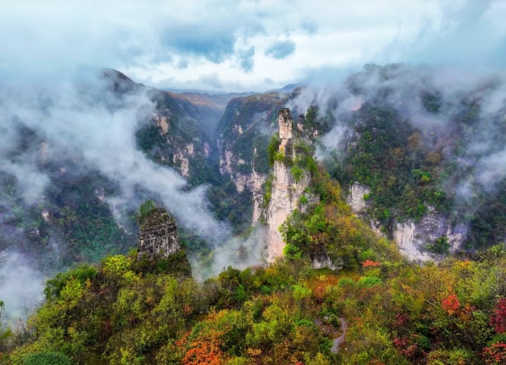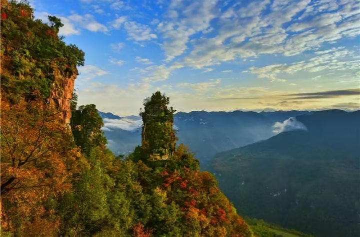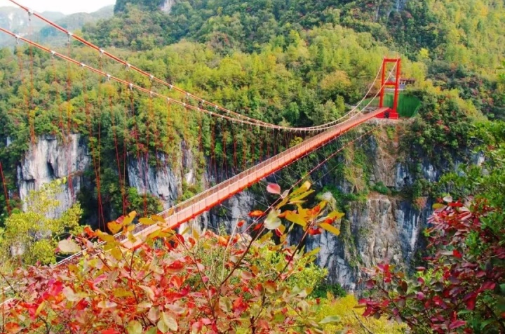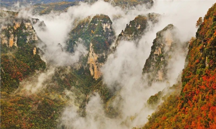 深秋时节,楚王峰身披金甲,蜡烛峰染红霞,枫叶流丹与银杏泛黄交相辉映,宛如大自然打翻的调色盘。乘索道俯瞰,层林尽染的峡谷风光尽收眼底,壮观而震撼;徒步古道,细赏秋光洒落的斑驳光影,感受时光的静谧流淌。