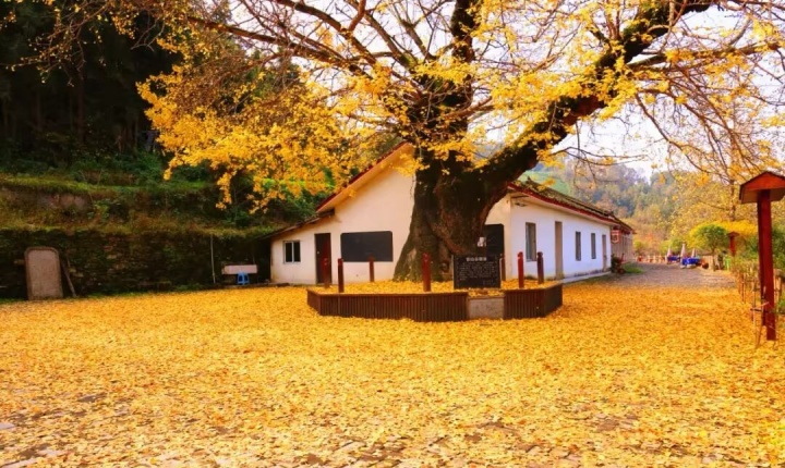 金秋时节,官山千年银杏黄。山舍、屋檐瓦上被金黄掩映,好似黄金遗落人间。官山古银杏已有千年历史,树干4人方可合抱。走进银杏树下,金黄的树叶铺撒一地,犹如精心绣制的地毯。