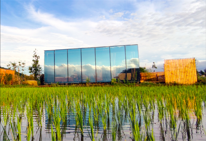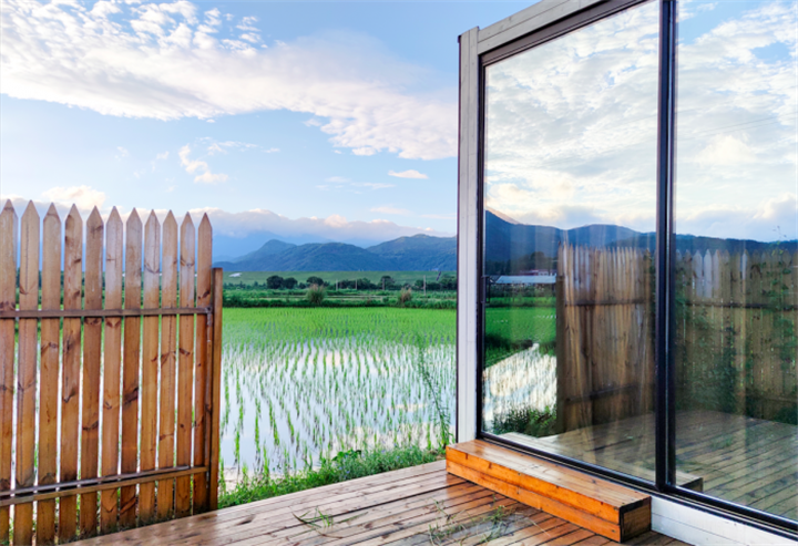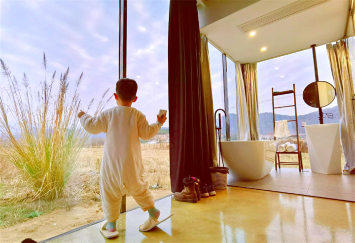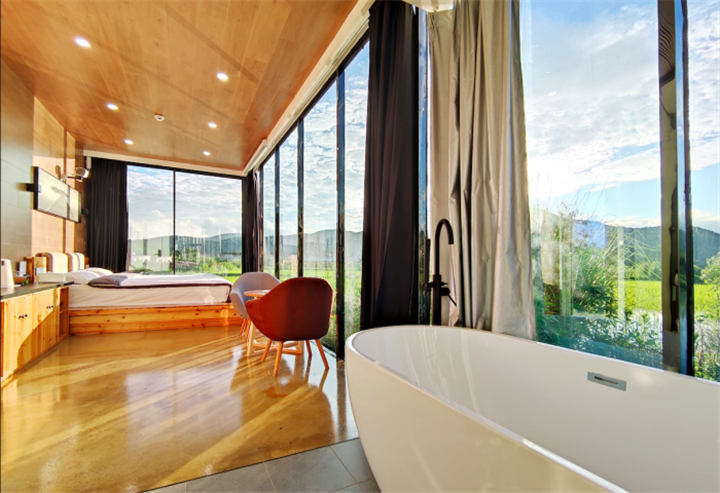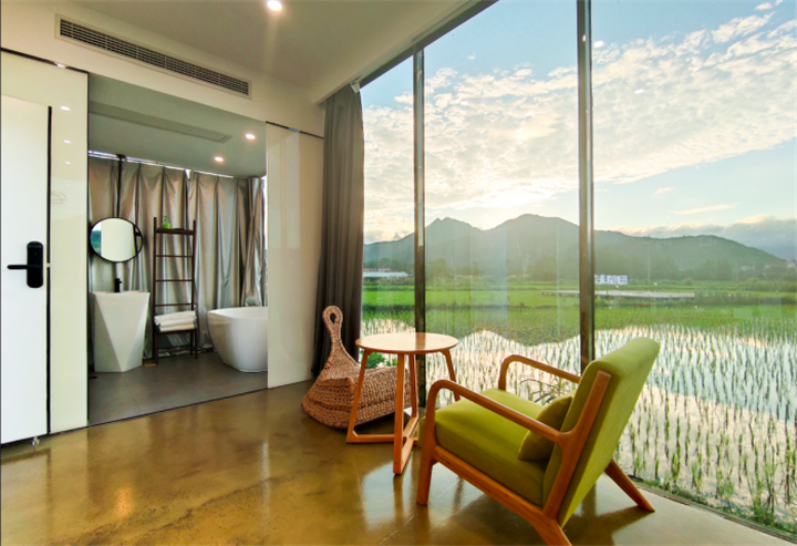 ②配套设施:天空之镜区;270度全景玻璃、稻田全景、山景、电动窗帘、中央空调、智能马桶、小院子,有独立院落,有浴缸,独立卫生间。