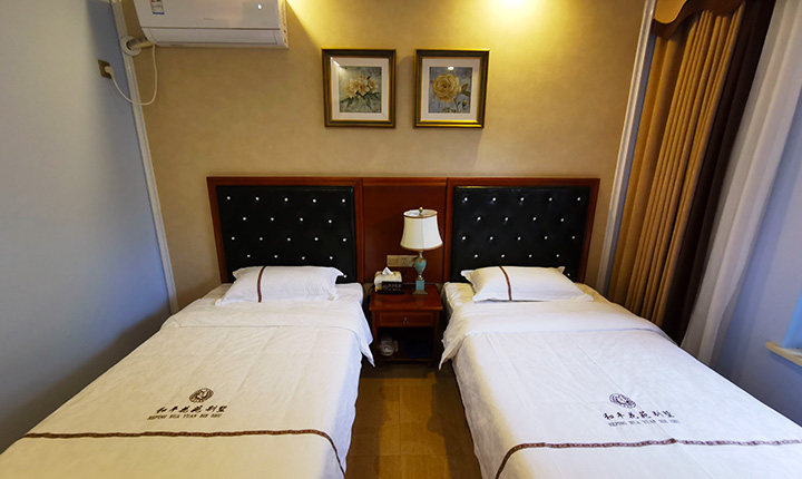①房型说明:2号商务别墅(两层,共3单2标4卫1棋牌,1楼:1单1标1棋牌,2楼:2单1标),单间:1.8*2米*1张床, 标间:1.2*2米*2张床,每间房含双早 。消费即可领取停车券,享免费停车。