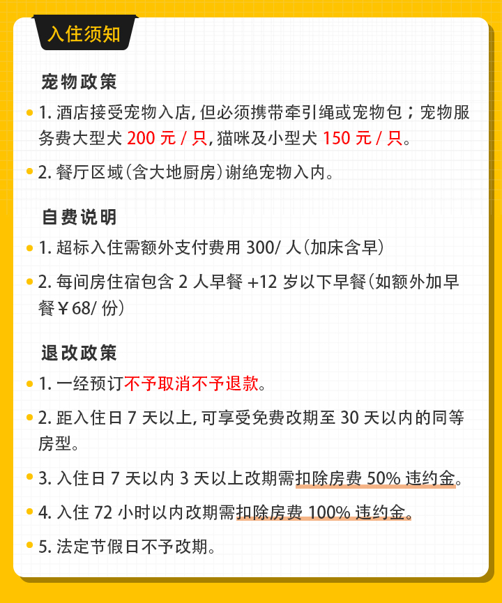 ②早餐说明:每间房住宿包含2人早餐+12岁以下早餐(如额外加早餐¥68/份)