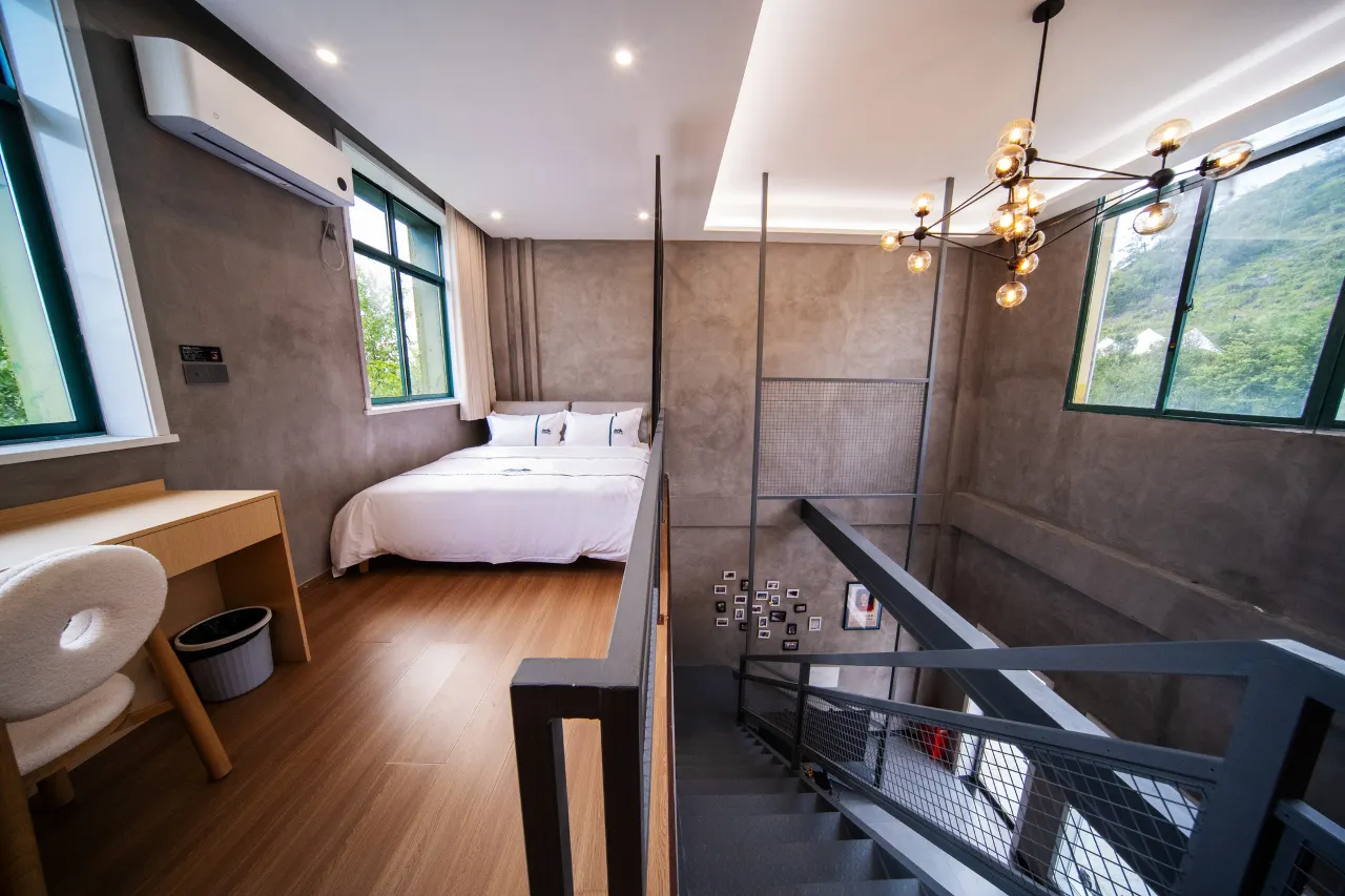 火车LOFT房:上下两层,1.8m大床一张,电视空调等配套齐全,独立卫浴,配有山景小阳台