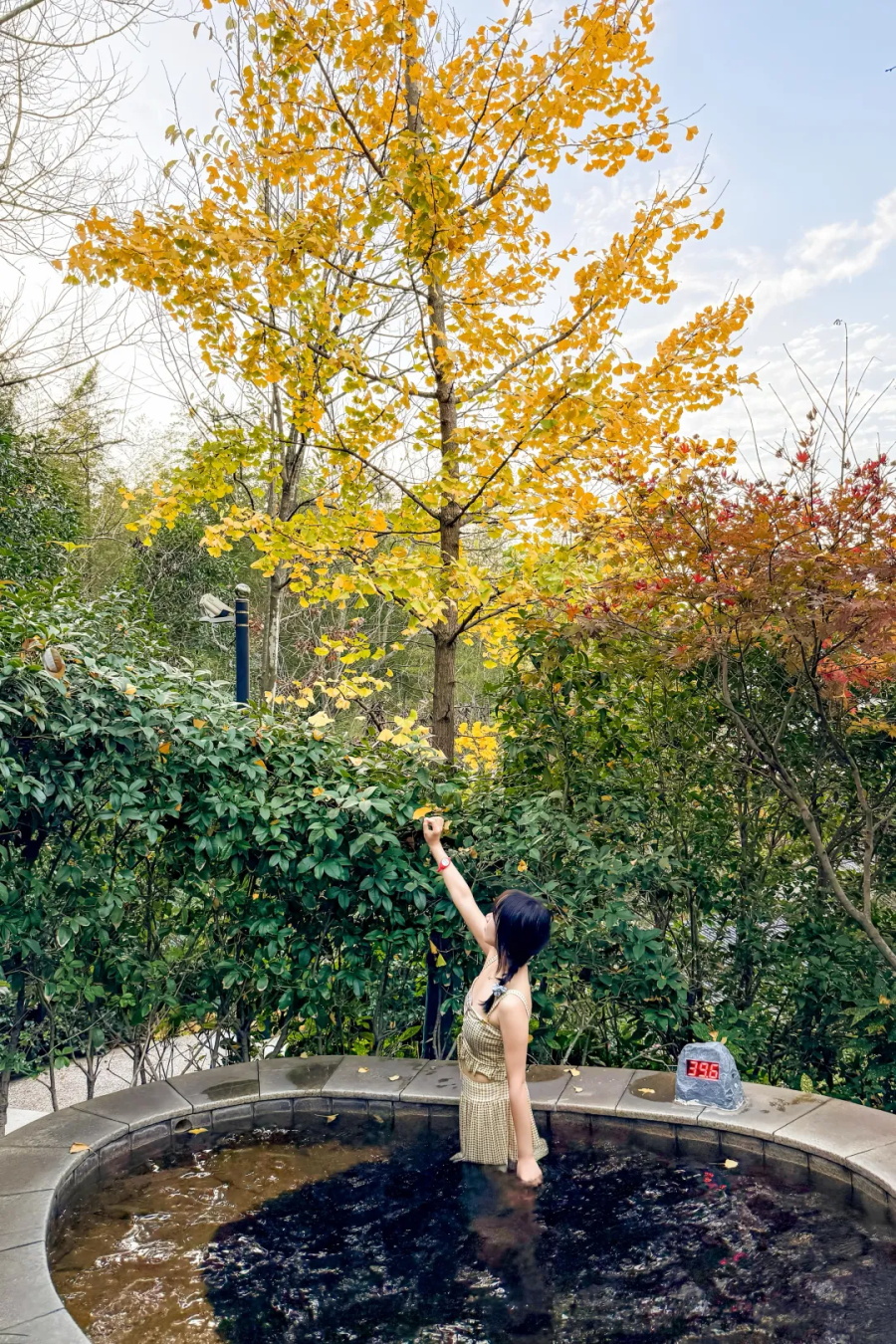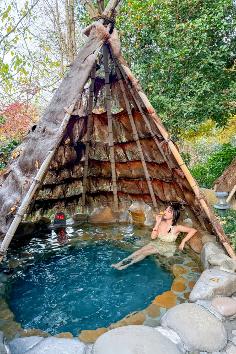 进入池中,温热的泉水恰到好处地包裹住身躯。睡前泡个美人汤,幸福感upupup!