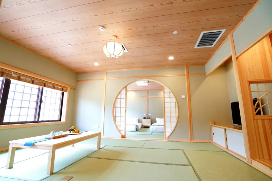 榻榻米、纸拉门、木栅格、矮脚茶几,推开房间门,一眼误入京都。