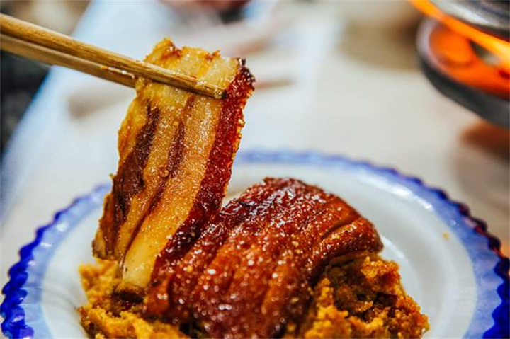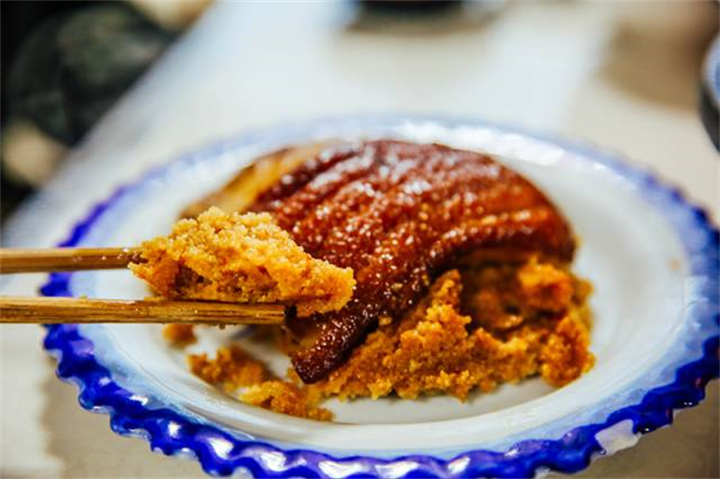 巴东扣肉多以五花肉为主料,先煮后炸再蒸肉皮金黄,肥而不腻,瘦而不柴,是巴东宴席上常见菜肴。