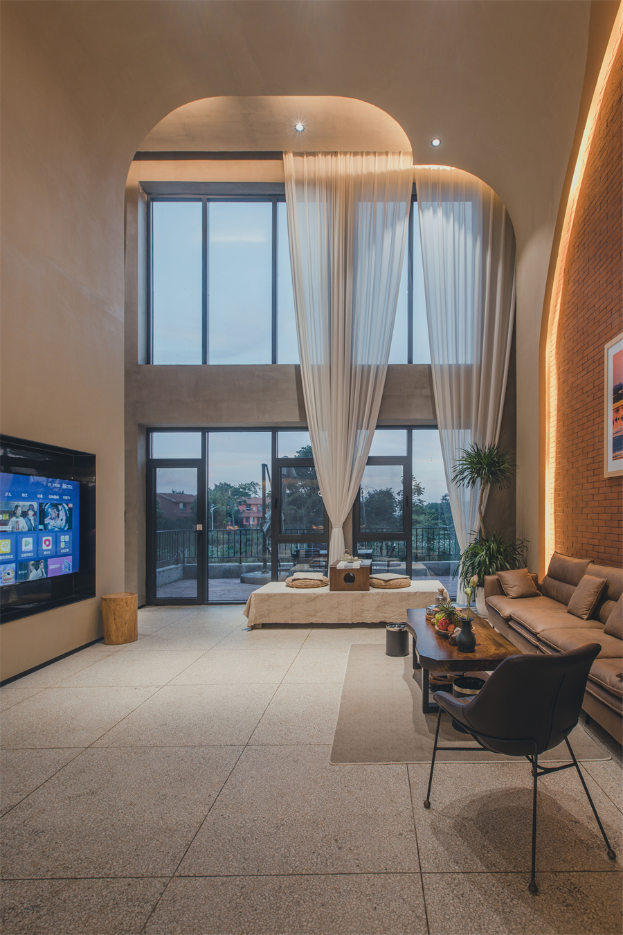 民宿餐厅在住宿区旁,有3层,1楼为公共餐厅,2楼为私人包间区,3 楼为观景餐厅。简约而富有艺术感的空间设计,处处设有超大全景落地窗,可以边吃饭边欣赏到周围田园美景。
