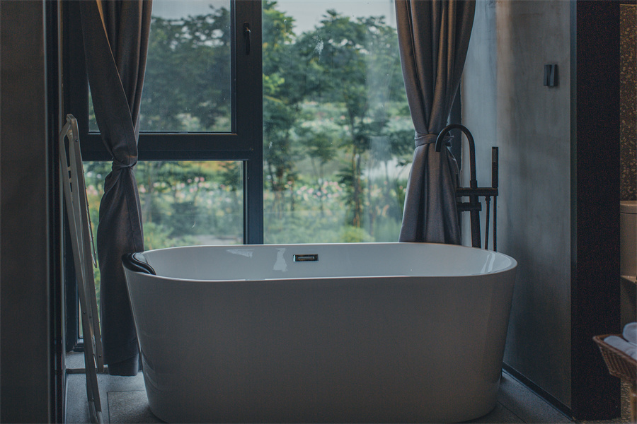 房间布置简约,没有多余的修饰,让人纯粹地享受自然和生活。浴室与卧室以巧妙的设计打通,泡在浴缸就能静享一片美景。