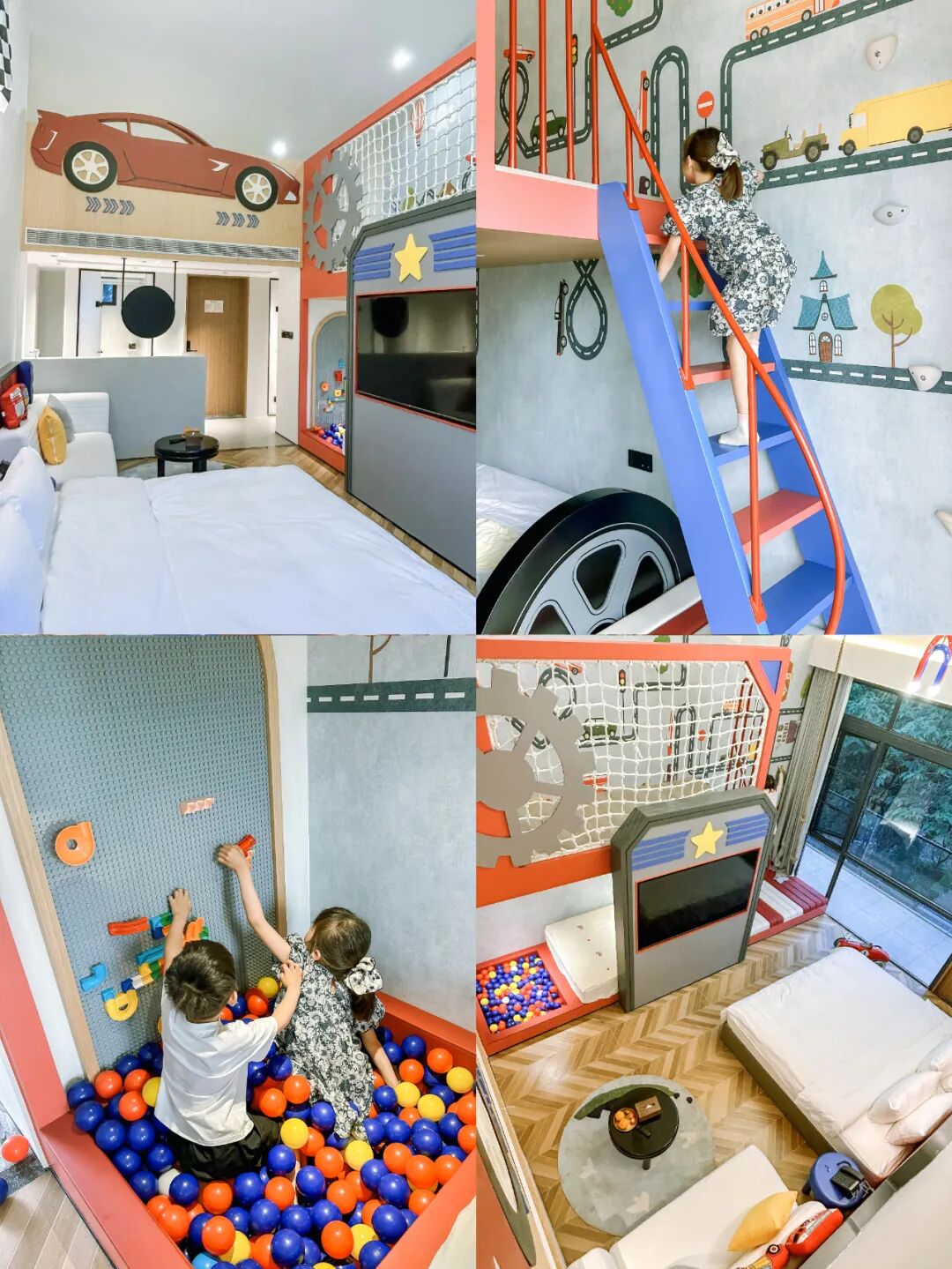 拥有绿野仙踪、星际探险、粉色城堡、汽车总动员等多种主题房,除了一楼自带小院子的庭院房外,二楼主题房间均为Loft设计,不仅有宽敞的大床,阁楼里还藏着属于孩子的秘密空间,滑梯、海洋球、攀岩墙直接搬进房间里。民宿按照星级标准打造,带娃出行也能轻松“解放双手”。