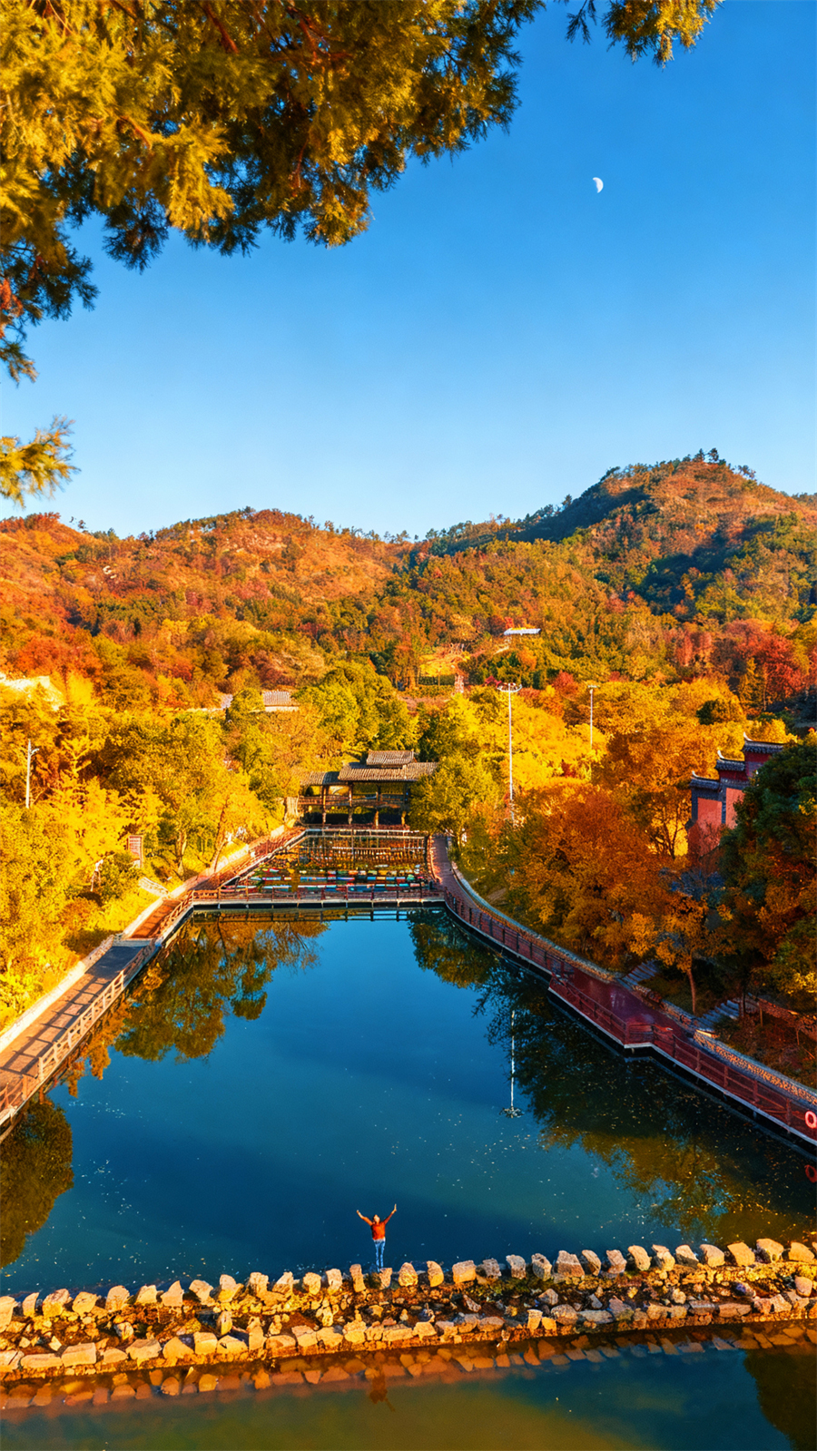 沿着园中的石桥前行,湖水清澈倒映着红枫与银杏,微风拂过,叶子簌簌飘落,偶尔落在肩头,像是山谷递来的 “信笺”。