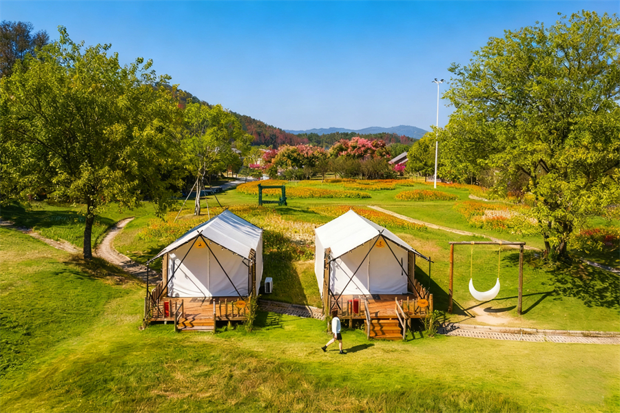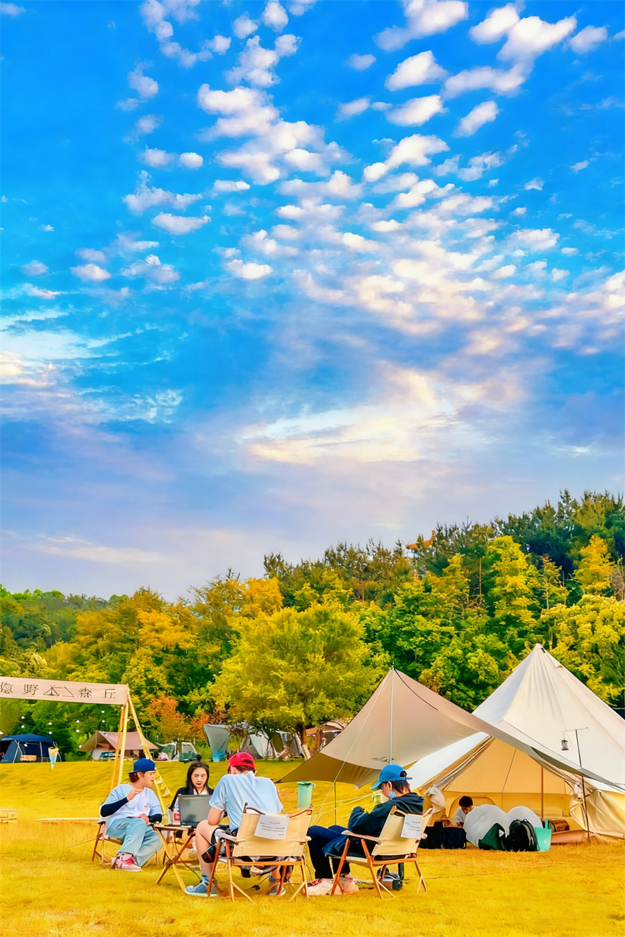“成年人的过家家,就是坐在这儿和大自然说说话”—— 野村谷的帐篷露营地,从春夏到深秋都让人留恋。在大草地上搭起营帐,旁边的小方桌摆满爱吃的美食,小朋友在草坪上追逐打闹,独具匠心的装饰品拉满秋游氛围。