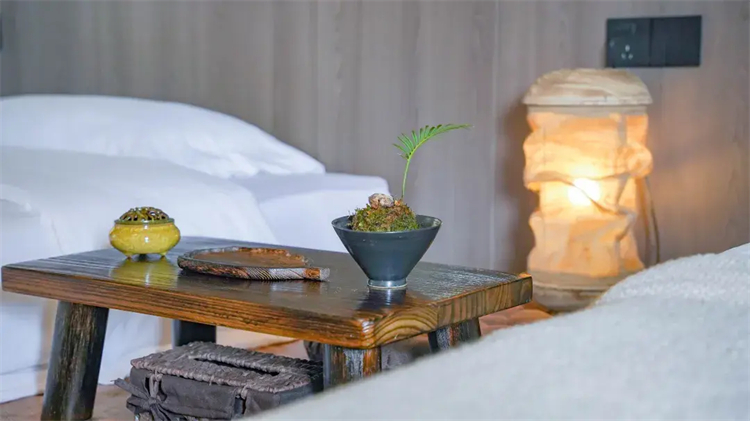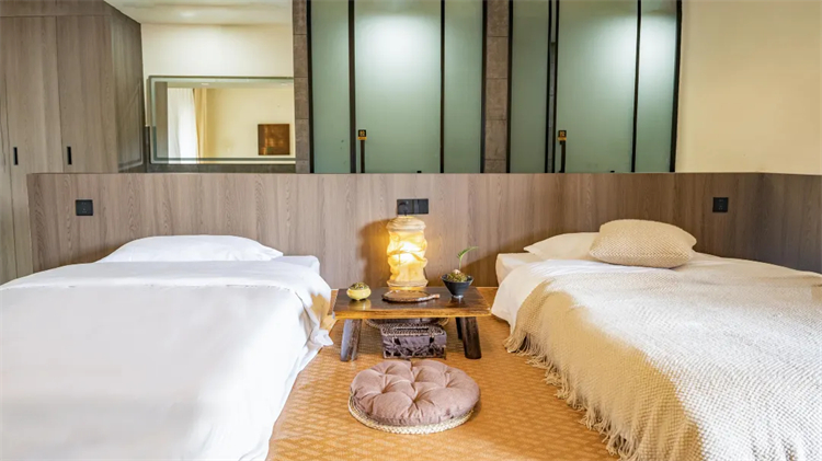 野谷雅舍其空间设计巧妙兼顾 “动” 与 “静”:白天可在柔软的榻榻米垫上围坐品茶,孩童能自在打滚玩耍,长辈可盘腿晒秋聊天;夜晚铺展被褥,便能拥着自然气息入眠,真正实现 “动静皆宜,老少皆宜”。